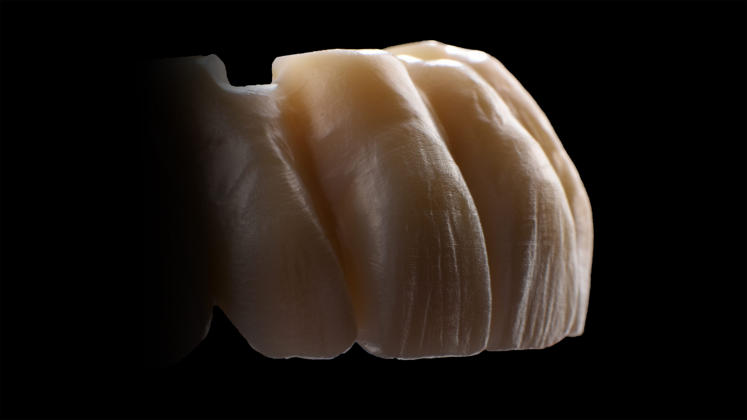 Auf der Grundlage der Abformung wurde ein Meistermodell mit Implantatanaloga und Gingivamaske hergestellt. Dieses wurde im Laborscanner Medit T710 (Medit, Seoul, Südkorea) digitalisiert, so dass die virtuelle Konstruktion aus Vita YZ STMulticolor in der exocad Software (exocad, Darmstadt, Deutschland) vorgenommen werden konnte. Abschließend folgte der Fräsauftrag an die Milling Unit Imes-icore 350i PRO (Imes-icore, Eiterfeld, Deutschland). Die grundlegende Form war nach dem Fräsvorgang schon präzise umgesetzt worden. Letzte Details der Morphologie und die Textur wurden nun schon im Rohzirkonoxid eingearbeitet. Als Instrumente dienten dafür ein Handstück mit Zirkonoxidfräser, ein Zirkonoxidskalpell, eine Drahtbürste aus Edelstahl und ein Pinsel. Die Ausarbeitung auf dem weißen Kreidestadium erfolgte unter einer Lampe, um währenddessen mit Licht und Schatten spielen zu können und über die Kontrastwirkung den Arbeitsstand erfassen zu können. Ziel war es, eine Morphologie und Textur entstehen zu lassen, die nach dem Sintern keiner Nacharbeit mehr bedurfte. Nach abschließender Kontrolle unter der Lampe konnten die ersten farblichen Effekte etabliert werden.