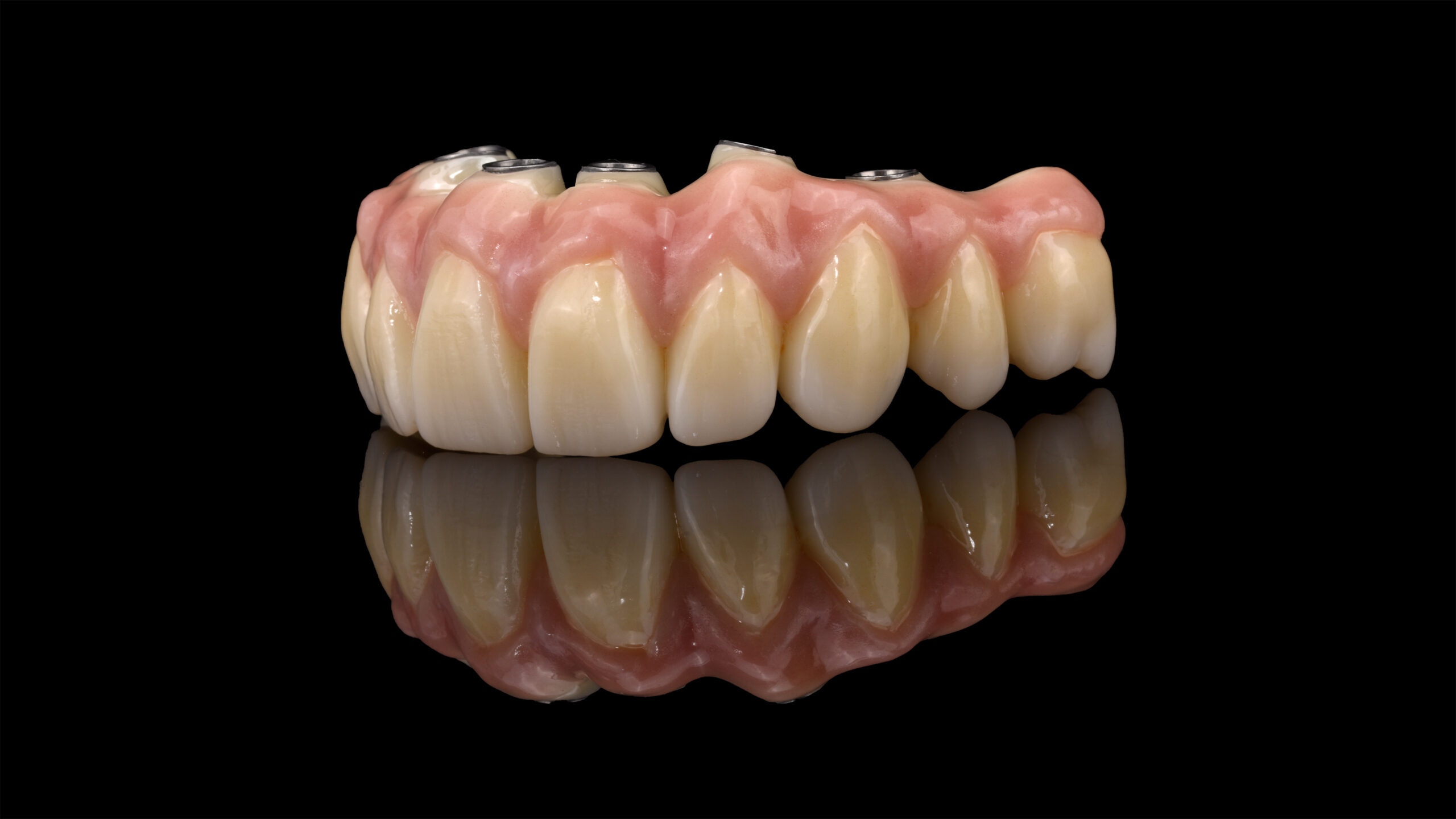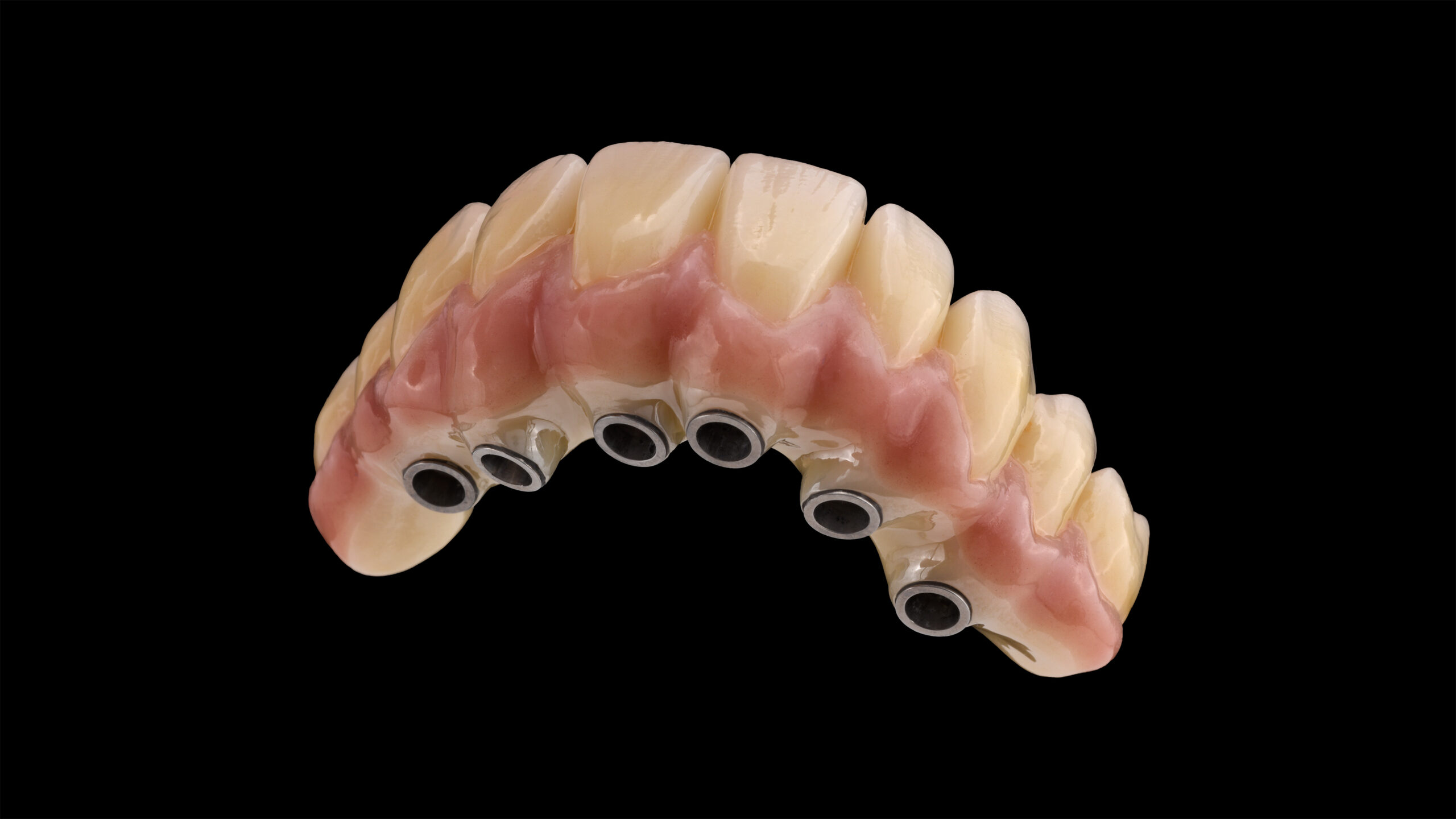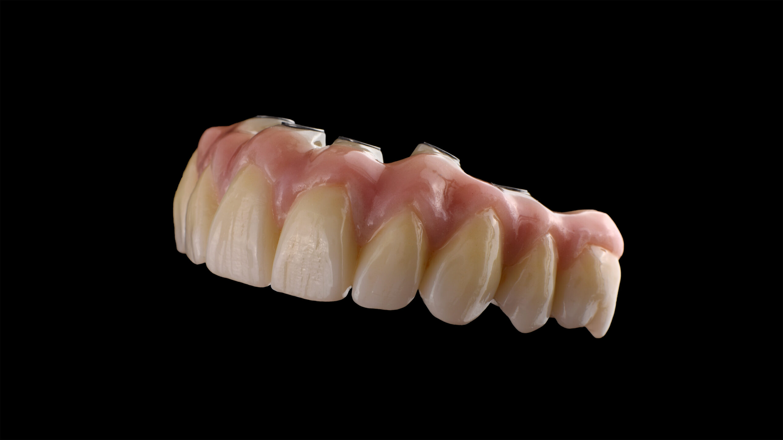 Nach dem Sintern wurden die mukogingivalen Anteile mit der universellen Verblendkeramik Vita Lumex AC reproduziert, wobei nur drei verschiedene Gingivamassen nötig waren, um die Anatomie des Patienten plastisch zu simulieren. Die Papillenbereiche erhielten ihre natürliche Wirkung mit Vita Lumex AC Gingiva rosewood, die Alveolar- und Zervikalregionen mit Gingiva nectarine. Die restlichen Bereiche wurden mit Gingiva light rose komplettiert. Nach einem ersten Brand wurde der gesamte Verblendbereich homogen mit transluzentem Enamel clear überschichtet, um die darunter liegenden Modellationen dreidimensional aus der Tiefe wirken zu lassen. Nach dem Brennen der Verblendkeramik erfolgte jetzt ein letztes Surface Enobeling mit dem Malfarbensystem Vita Akzent Plus. Zervikal und im Bereich des Dentinkörpers wurde mit Vita Akzent Plus Body Stains 02 (BS02) gelb-braun intensiviert. Die Eckzähne wurden im Bereich des Dentinkörpers mit BS04 (olive-grau) noch chromatischer gestaltet als die restlichen Zähne. Die Einarbeitung von inzisalen Effekten erfolgte mit Effect Stains 10 (lila) und 11 (blau). Nach dem Fixierbrand erfolgte die Glasur mit Vita Akzent Plus Glaze Spray, was einen dünnen, homogenen und schnellen Auftrag ermöglicht. Nach dem Glasurbrand wurden die Implantatschnittstellen mit dem universellen Befestigungssystem Vita Adiva in die implantatprothetische Suprakonstruktion eingefügt.