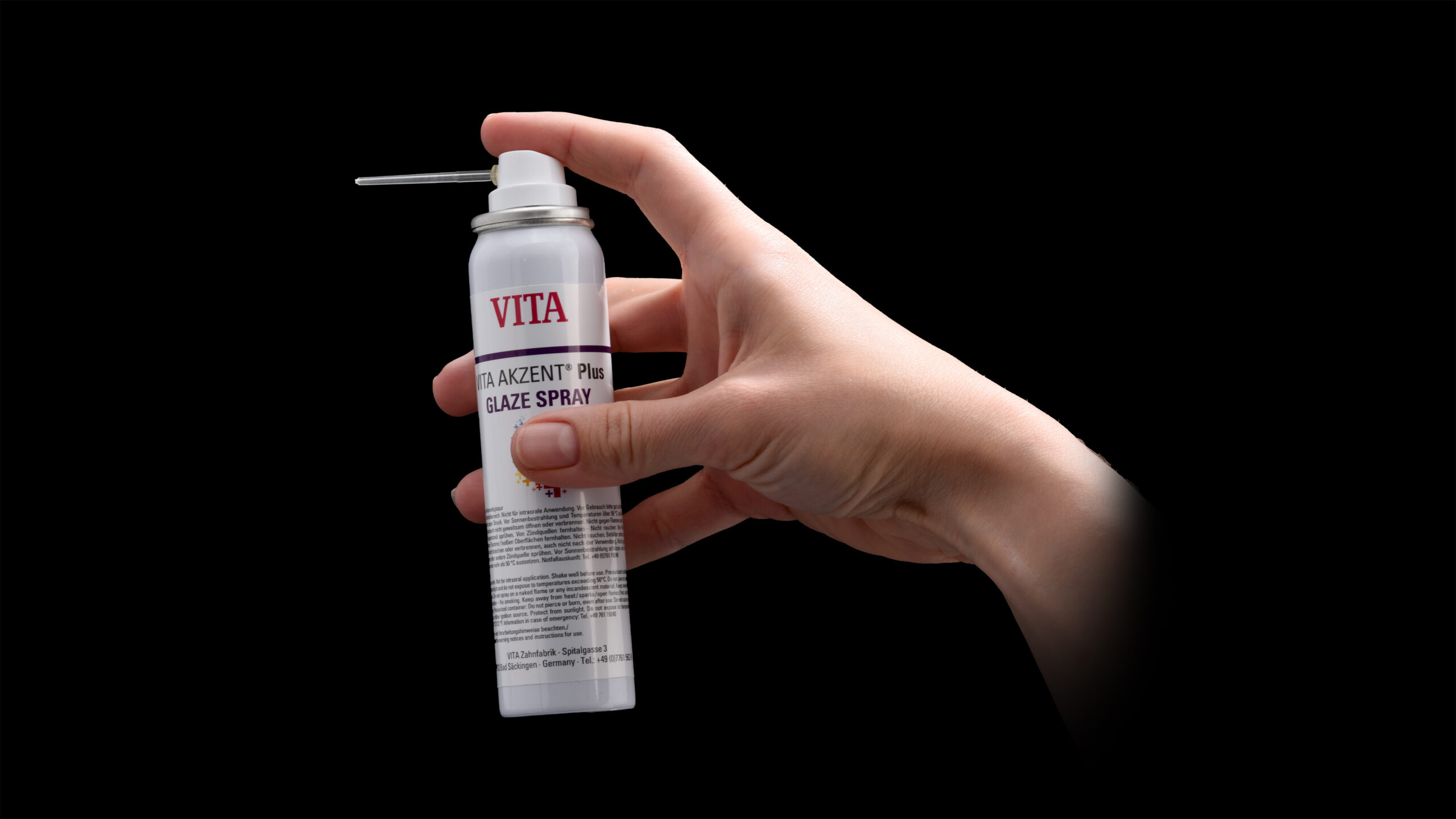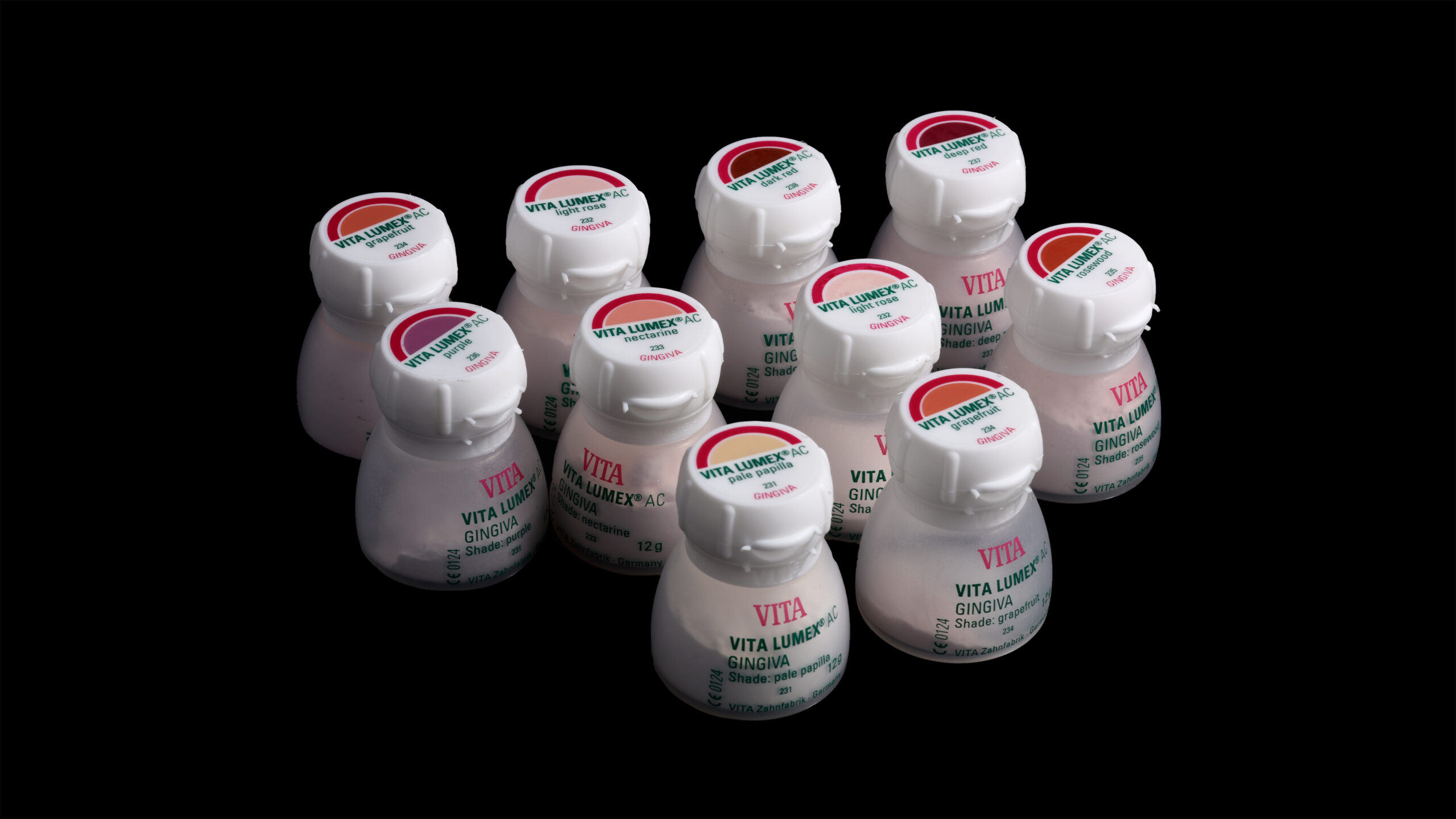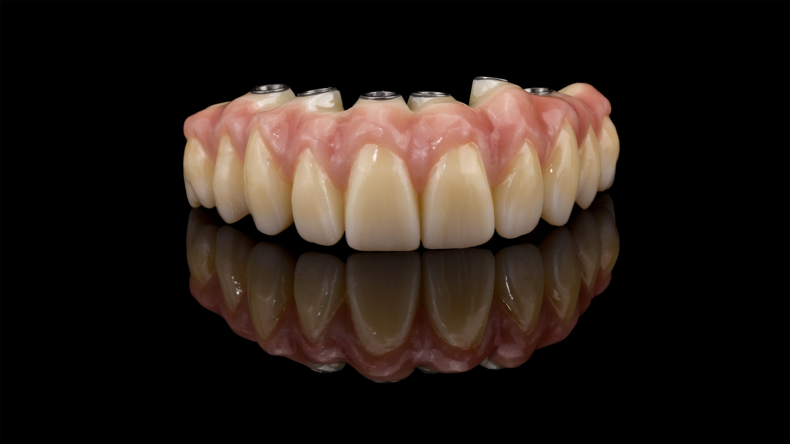 Nach dem Sintern wurden die mukogingivalen Anteile mit der universellen Verblendkeramik Vita Lumex AC reproduziert, wobei nur drei verschiedene Gingivamassen nötig waren, um die Anatomie des Patienten plastisch zu simulieren. Die Papillenbereiche erhielten ihre natürliche Wirkung mit Vita Lumex AC Gingiva rosewood, die Alveolar- und Zervikalregionen mit Gingiva nectarine. Die restlichen Bereiche wurden mit Gingiva light rose komplettiert. Nach einem ersten Brand wurde der gesamte Verblendbereich homogen mit transluzentem Enamel clear überschichtet, um die darunter liegenden Modellationen dreidimensional aus der Tiefe wirken zu lassen. Nach dem Brennen der Verblendkeramik erfolgte jetzt ein letztes Surface Enobeling mit dem Malfarbensystem Vita Akzent Plus. Zervikal und im Bereich des Dentinkörpers wurde mit Vita Akzent Plus Body Stains 02 (BS02) gelb-braun intensiviert. Die Eckzähne wurden im Bereich des Dentinkörpers mit BS04 (olive-grau) noch chromatischer gestaltet als die restlichen Zähne. Die Einarbeitung von inzisalen Effekten erfolgte mit Effect Stains 10 (lila) und 11 (blau). Nach dem Fixierbrand erfolgte die Glasur mit Vita Akzent Plus Glaze Spray, was einen dünnen, homogenen und schnellen Auftrag ermöglicht. Nach dem Glasurbrand wurden die Implantatschnittstellen mit dem universellen Befestigungssystem Vita Adiva in die implantatprothetische Suprakonstruktion eingefügt.