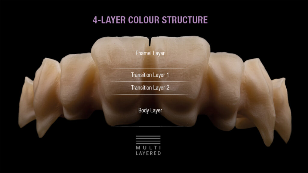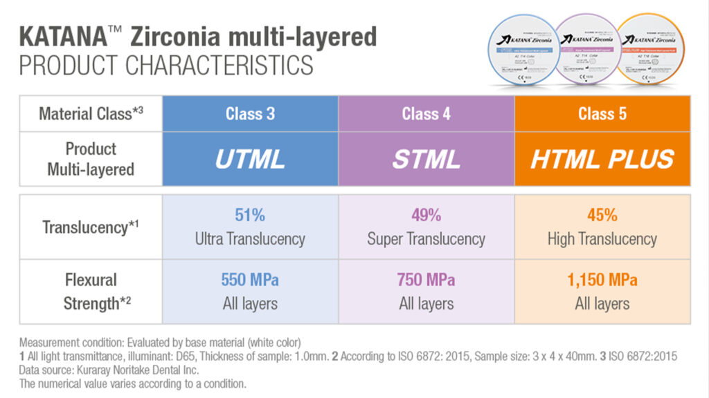 Drei verschiedene Katana Zirconia-Produkte mit vierschichtigem Farbaufbau, die sich in Lichtdurchlässigkeit und Biegefestigkeit unterscheiden.