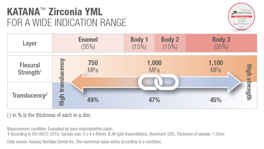 Katana Zirconia YML: Mehrschichtige Zirkonoxid-Scheibe mit Farb-, Transluzenz- und Biegefestigkeitsabstufung