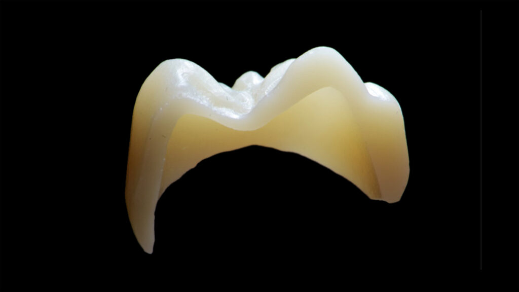 Äußerst gleichmäßige Ränder einer Katana Zirconia-Krone nach dem Fräsen, was auch auf die günstige Materialstruktur zurückzuführen ist.