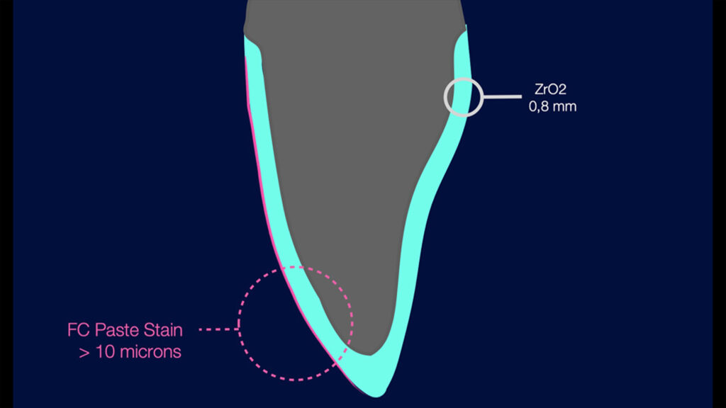 Alle Produkte haben eines gemeinsam: Da sie auf synthetischer Feldspat-Keramik basieren, bieten sie konsistente Eigenschaften und vorhersagbare Farbeffekte. Die Materialstruktur und Partikelverteilung ähneln denen natürlicher Zähne und unterstützen naturgetreue Ergebnisse. Ein reduzierter Aufwand wird mit dem Flüssigkeramiksystem Cerabien ZR FC Paste Stain auf einer monolithischen Restauration oder einer Restauration mit minimalem Cut-Back (0,1 mm) erreicht.