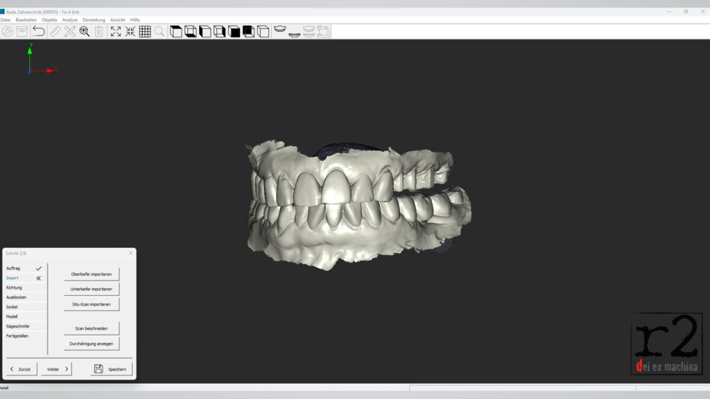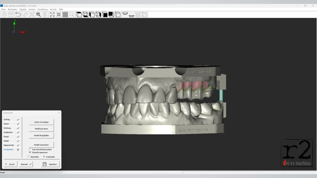 Bade: „CAD Fix it Erik“ ist mehr als ein Model-Builder. Es ist ein durchdachtes digitales Modellkonzept und bietet uns gleich mehrere Vorteile. Zum einen ermöglicht uns das intelligente System die Herstellung von Modellen mit Split Cast und integrierten Magneten oder Metallplatten in verschiedenen Größen für unterschiedliche Sockel – alles in einem einzigen Arbeitsgang. Wir haben die Flexibilität, zwischen einem Massivsockel und einer Wabenstruktur zu wählen. Hilfreiches Feature ist auch das Durchdringungsprotokoll, das von der Software generiert wird. Damit können wir den digitalen Biss prüfen und das Protokoll der Zahnarztpraxis zur Kontrolle bzw. als Einschleifhilfe für Frühkontakte senden. Schließlich sorgt die Möglichkeit, die Modelle durch genormte Metallstifte in verschiedenen, frei wählbaren Längen zu fixieren, für eine hohe Präzision und Stabilität der Modelle zueinander. Dies erhöht die Qualität unserer Arbeit und spart uns im Zusammenspiel mit einem hochwertigen 3D-Drucksystem und dentalen 3D-Druckresinen wertvolle Zeit im Alltag.
