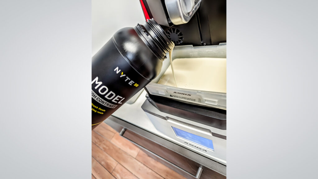 10b - Drucken der Modelle aus Nyte3D Model High-Contrast. Wichtig: befindet sich das Material bereits längere Zeit in der Materialwanne, sollte es vor Gebrauch sorgfältig mit einem Silikonspatel oder einer folienkaschierten Visitenkarte verrührt werden.