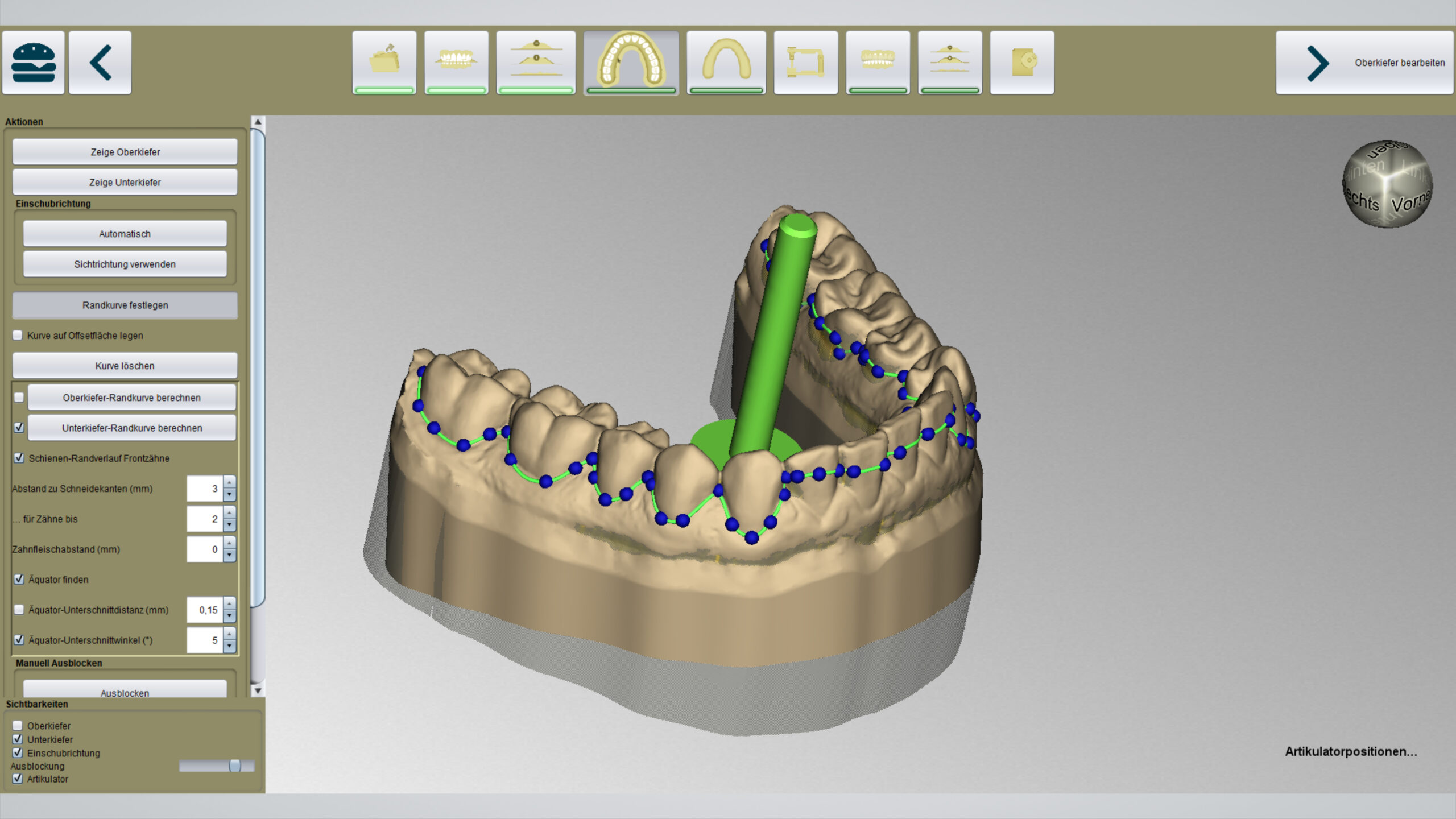 So kann der Anwender seine Daten per Drag & Drop in die Software laden und zwischen einer halb automatischen oder vollautomatischen Konstruktion entscheiden. Bei der halb automatischen Konstruktion klickt sich der Anwender selbstständig durch jeden Schritt. So wird nach der automatischen Ausrichtung der Einschubrichtung der Anwender erstmals von der KI unterstützt – bei der automatischen Randkurvenberechnung. Für die klassische Aufbissschiene endet bereits die Konstruktion und man kann die fertige Schiene exportieren. Für die adjustierte Schiene gelangt man anschließend zu dem virtuellen Artikulator. Werte, wie eine Bisserhöhung, die Kondylenbahnneigung oder der Bennettwinkel können hier individuell eingestellt werden. Denn nun wird das Design der adjustierten Schiene unter Berücksichtigung der dynamischen Okklusion wieder von der künstlichen Intelligenz übernommen und die Schiene ist fertig zum Export.