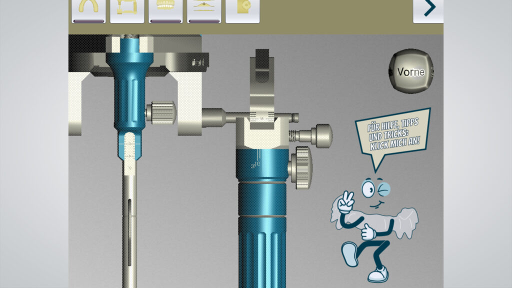 Ist der Megatrend KI überhaupt sinnvoll im Zahntechnikerhandwerk und ist „das Ende der Fahnenstange“ nicht schon bald in Sicht? Promadent glaubt mit BiSS Freeform weder einen Zerstörer noch einen Erlöser geschaffen zu haben, sondern eine Schlüsseltechnologie für den Alltag, um sich zukunftsfähig aufzustellen. Mittlerweile hat Freeform einen schlanken Workflow, der ähnlich gestaltet wurde, wie alle anderen Applikationen der BiSS Dental Software Suite. Der Anwender wird Schritt für Schritt durch die Konstruktion geführt und erhält sogar dank dem Helferlein „Schieni“, siehe Abbildung 3, eine ausführliche Erklärung in jedem Arbeitsschritt.