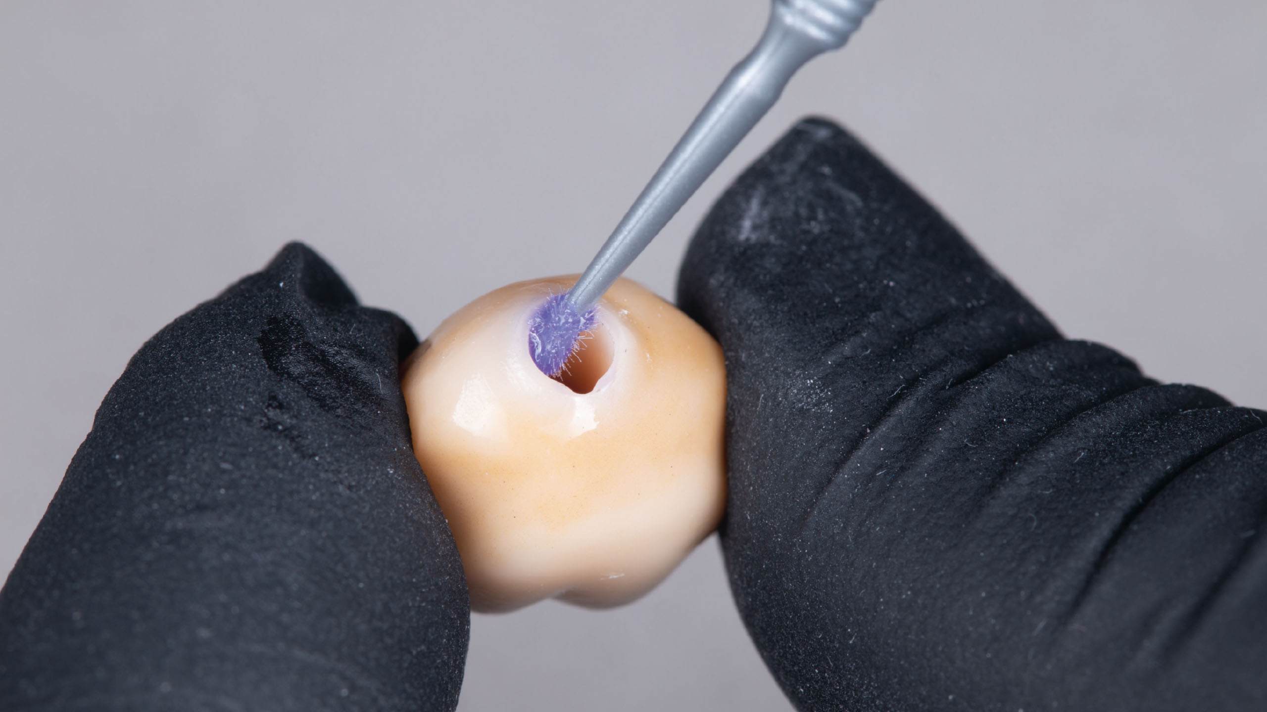 06 - Ztm. Simon Stroh: Vor dem Verkleben eines Hybrid-Abutments mit der Titanbasis wird die Oberfläche mit Katana Cleaner gereinigt. So wird eine saubere Grundlage für das langzeitstabile Verkleben geschaffen.