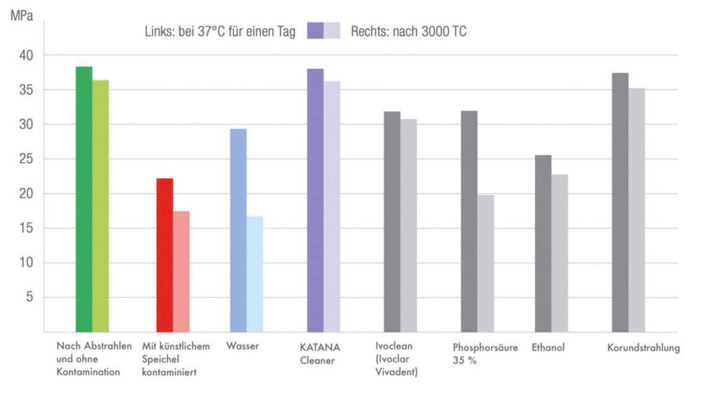 Dr. Elsayed: Jedwede Kontamination beeinflusst den adhäsiven Haftverbund negativ; unabhängig vom Material. Beispiel: Bei einer Einprobe der Restauration im Mund wird die Restaurationsoberfläche verunreinigt. Speichel, gegebenenfalls Blut et ­cetera sammeln sich an; die Proteine hieraus wirken als Isolator für alle nachfolgenden Komponenten, zum Beispiel den ­Primer. Daher muss jede Kontamination vor der ­adhäsiven Befestigung gründlich beseitigt werden. Dies gilt Übrigens auch bei direkten adhäsiven Restaurationen. Katana Cleaner bietet hierfür einen einfachen und schnellen Weg.