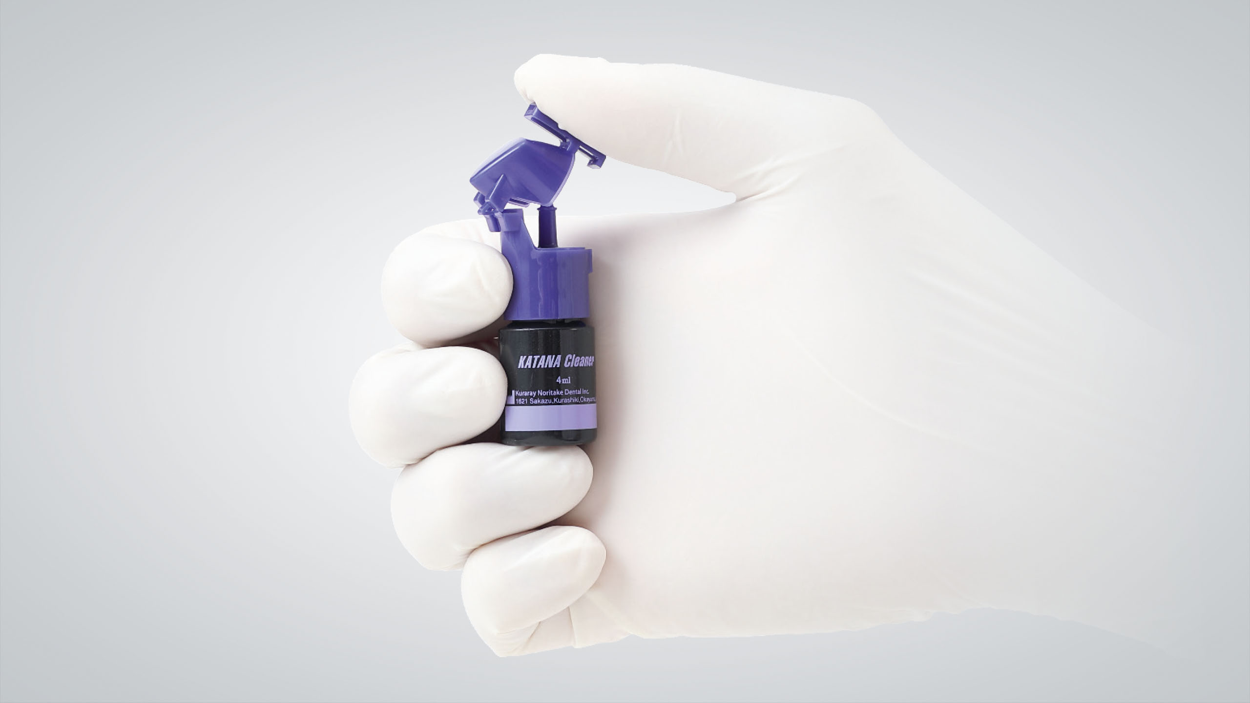 Dr. Elsayed: Idealerweise sollte eine keramische Restauration nach der Anprobe und unmittelbar vor der Befestigung konditioniert werden. Allerdings haben viele Zahnarztpraxen nicht die Möglichkeit des Ätzens oder des Abstrahlens. Hier kann das Dentallabor diese Aufgabe übernehmen. Unabhängig davon, wer diese wichtige Aufgabe übernimmt: Die Restaurationsoberfläche muss direkt vor der Befestigung dekontaminiert werden. Verunreinigungen sind gründlich zu entfernen. Ein Spülen mit Wasser oder Alkohol ist hierfür nachweislich nicht ausreichend. Daher wurden Reinigungslösungen wie Katana Cleaner von Kuraray ­Noritake entwickelt (Abb. 3 und 4).