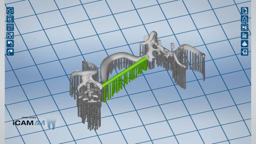Berechnung in der CAM-Software, automatisches Setzen von okklusalen Supports und Querverstrebungen zur Stabilisierung, damit es beim Vergütungsprozess zu keinem Verzug kommt