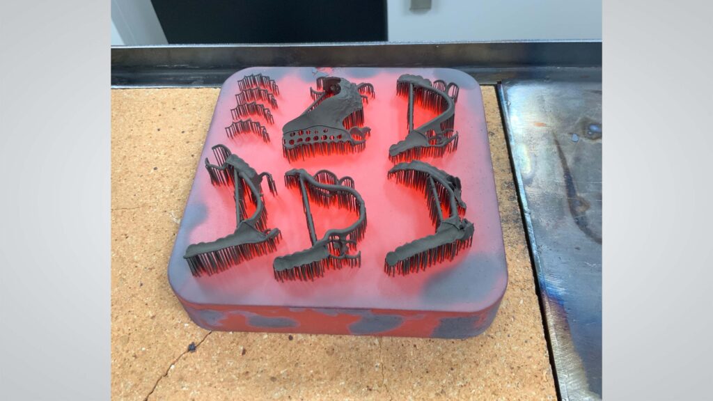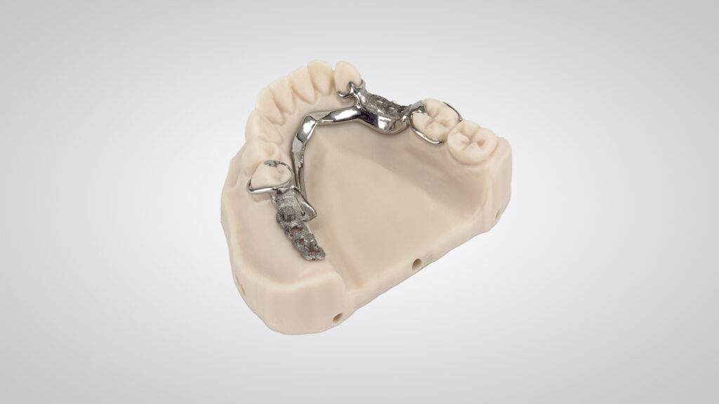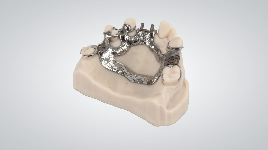 Erfahrungen von J.B. Zahntechnik nach einem Jahr Hybridfertigung: Versorgungen: Teleskope, Modellgüsse, Stegüberwürfe und Retainer. Die eckigen Bauplatten werden für Modellgüsse genutzt, weil diese nicht nachgefräst werden müssen. Druck von 6–8 Stück in einem Durchdurchgang abhängig von ihrer Größe. Runde Platte für Teleskope und Stegüberwürfe, da diese nachgefräst werden. Abhängig vom Kiefer: bequem 3 Einheiten. Die Kollegin stellt sich der Challenge, auch 4–5 Einheiten zu platzieren, das ist ein bisschen Tetris. Druckdauer: Abhängig von der Höhe des Drucks: 8–10 Stunden. Die Anlage läuft zwei Mal am Tag. Nach dem Tageslauf erfolgen das Ausbetten und Umbauen. Vorbereitung des Druckjobs für den Nachtlauf. Einheiten pro Durchgang: Auf der 150 x 150 mm Platte: ca. 200–250 Einheiten Platzbedarf: Die Anlage braucht ihren eigenen Raum, es wurde eine Trennwand eingezogen, Klimaanlage und Absaugung eingebaut. Die Raumgröße sollte mindestens 15 m² betragen. Die Abmessungen müssen vorher bedacht werden. Frontseitig muss genügend Platz zum Beladen unter Zuhilfenahme des Lifters vorhanden sein. 440 kg. Breite x Tiefe x Höhe: 1100 x 790 x 1900 mm Profit für Zahnärzte Präzision, Passung, Reproduzierbarkeit, keine Lunker und keine Fehlgüsse. Hohe Zufriedenheit, dadurch weniger Patienten zum Nacharbeiten nach dem Eingliedern von leichtgängigeren Versorgungen und dadurch natürlich Zeiteffizienz.