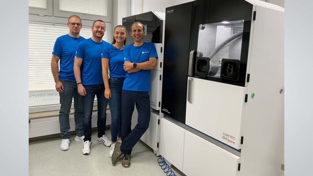Die CORiTEC AM100 arbeitet nach dem Laser-Powder-Bed-Fusion-Verfahren. Dabei schmilzt ein 200-Watt-Faserlaser mit einem Fokusdurchmesser von 45–70 µm das Pulvermaterial Schicht für Schicht auf. Dies ermöglicht die Herstellung komplexester Geometrien auf einer Fläche von 150 x 150 x 150 mm. Diese moderne Technologie vereint Schnelligkeit und Nachhaltigkeit und führt so zu einer kostengünstigen Herstellung von zahntechnischen Versorgungen.