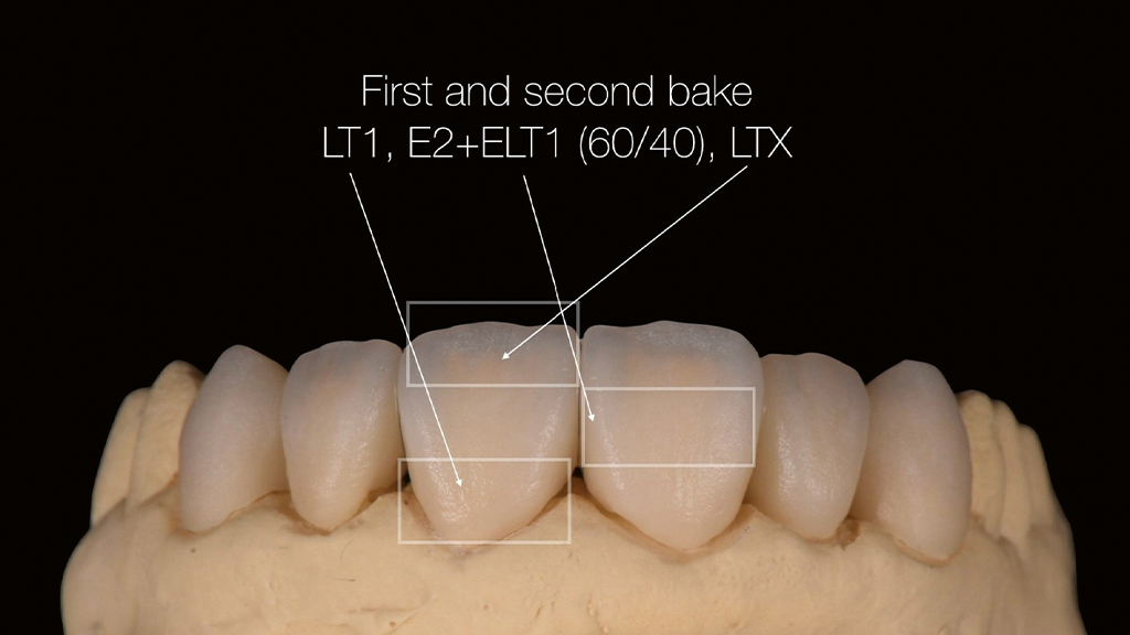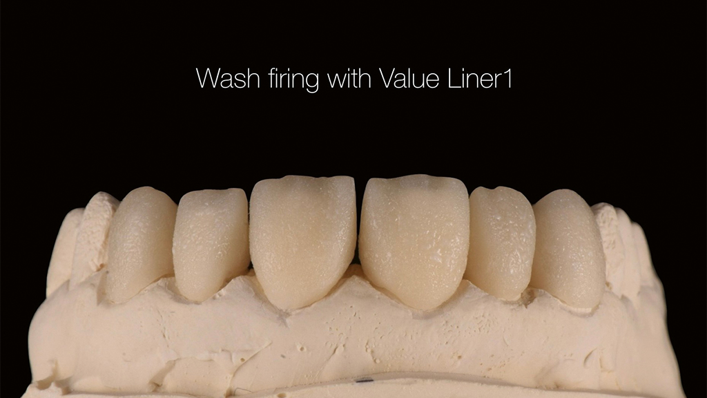 MiLai macht das Micro-Layering systematisch und effizient. Nach der Gestaltung des Gerüsts in nahezu monolithischer Form folgt bei Bedarf ein Waschbrand mit Value Liner – besonders wichtig bei Lithiumdisilikat zur Kontrolle der Helligkeit. Die MiLai-Charakterisierung mit internen Malfarben sorgt für natürliche Tiefenwirkung. Nach dem Auftrag der Effekt- und Lustermassen und morphologischen Korrekturen wird der Glanzgrad entweder durch Self-Glaze oder Cerabien ZR FC Paste Stain erzielt.