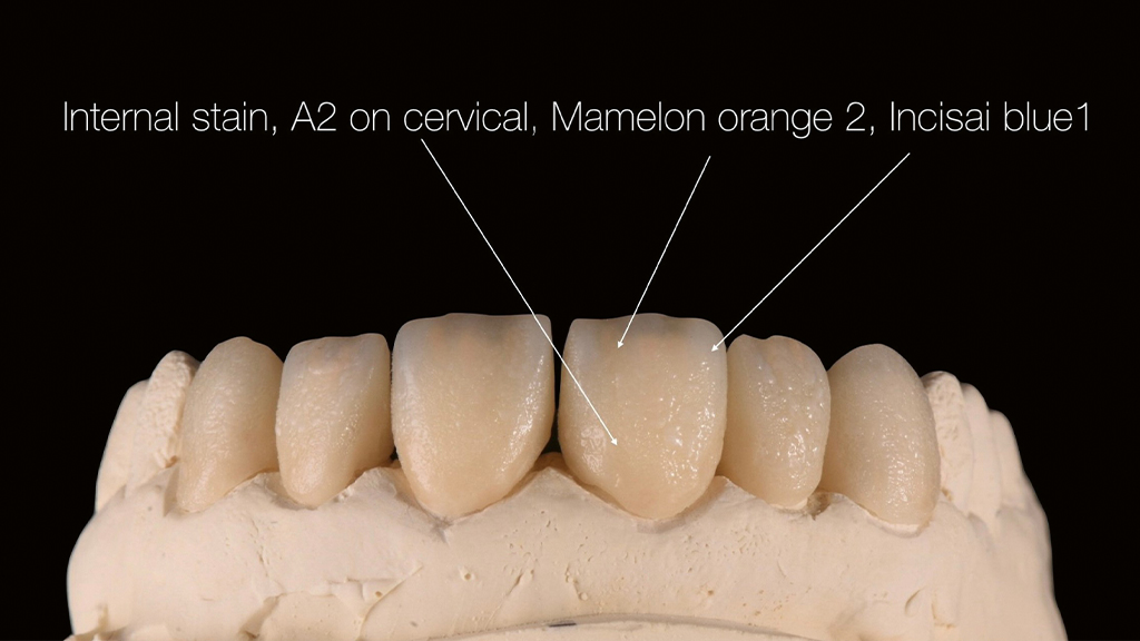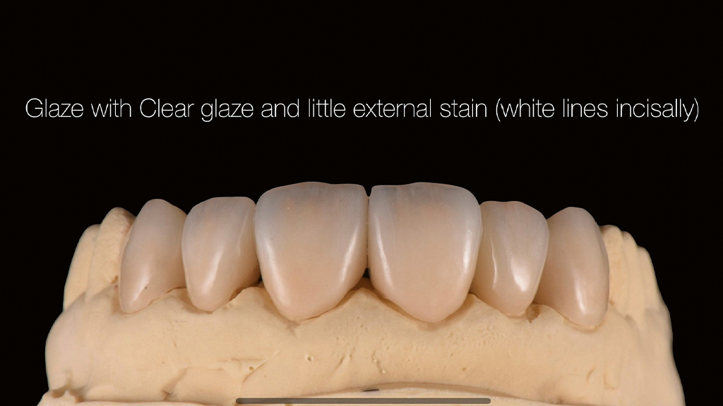 05 - Finalisierte Restaurationen mit Cerabien ZR FC Paste Stain Clear Glaze und externen Malfarben, um inzisal feine Linien hinzuzufügen.
