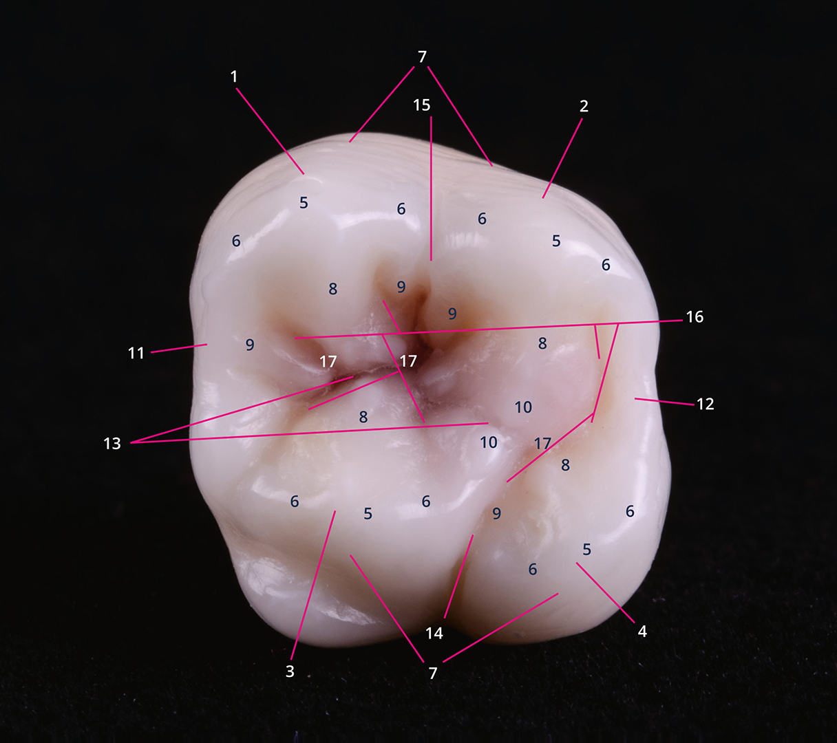 Der obere erste Molar wirkt von okklusal wie ein Rhombus, also versetzt. Er weist vier massive Höcker und einen nur schwach ausgebildeten fünften Höcker mesio-palatinal auf (Carabelli-Höcker). Im Bereich der Molaren treten die größten Kaukräfte auf. Umso wichtiger ist dort die richtige Gestaltung und Anordnung einer natürlichen sowie funktionellen Kaufläche, auf die ich im zweiten Bericht zur Funktion näher eingehen werde (Abb. 1.4–1.7).