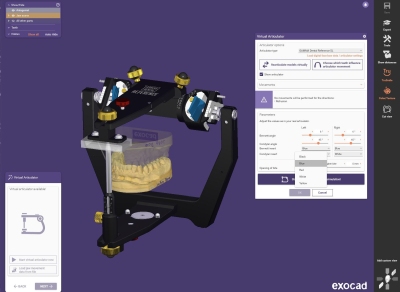 Bei diesem Add-on Modul für DentalCAD ist ein neues Feature dazugekommen, mit dem User jetzt auch Artikulatoren nutzen können, bei denen der Inzisaltisch am oberen, beweglichen Teil des Artikulators befestigt ist. Diese Artikulatoren bieten einen alternativen Weg, die Kieferbewegungen eines Menschen nachzuempfinden. Daher wurde diese Möglichkeit öfter nachgefragt. Nun ist dieses Feature erstmalig mit der Integration des virtuellen Artikulators Gamma Dental Reference SL umgesetzt worden (Abb. 1). Die Software unterstützt diesen Artikulator in allen Funktionen, zum Beispiel die fünffach individualisierbare Exzentrik durch austauschbare SKN- und TKN-Elemente. Weitere Artikulatoren mit an der Oberseite montiertem Inzisalteller werden sukzessive integriert.