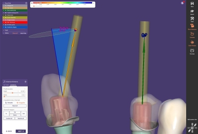 Neu ist dabei: In der Software ist die vom Hersteller definierte Geometrie der Titanbasis hinterlegt und wird bei der Gestaltung des abgewinkelten Schraubenkanals automatisch berücksichtigt (Abb. 4 und 5).