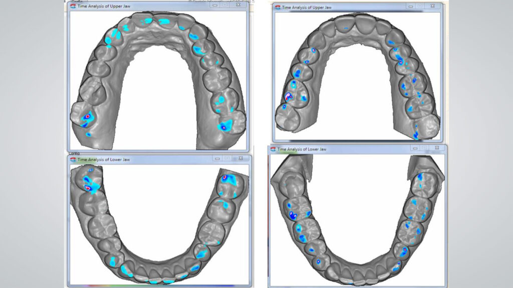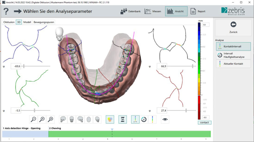 Durch diese Verknüpfung lassen sich nicht nur statische Kontakte, sondern vor allem auch dynamische Belastungsmuster während natürlicher Bewegungsabläufe analysieren. So wird sichtbar, welche okklusalen Flächen beim Kauen besonders häufig adressiert werden und wo möglicherweise eine Überlastung einzelner Bereiche droht.