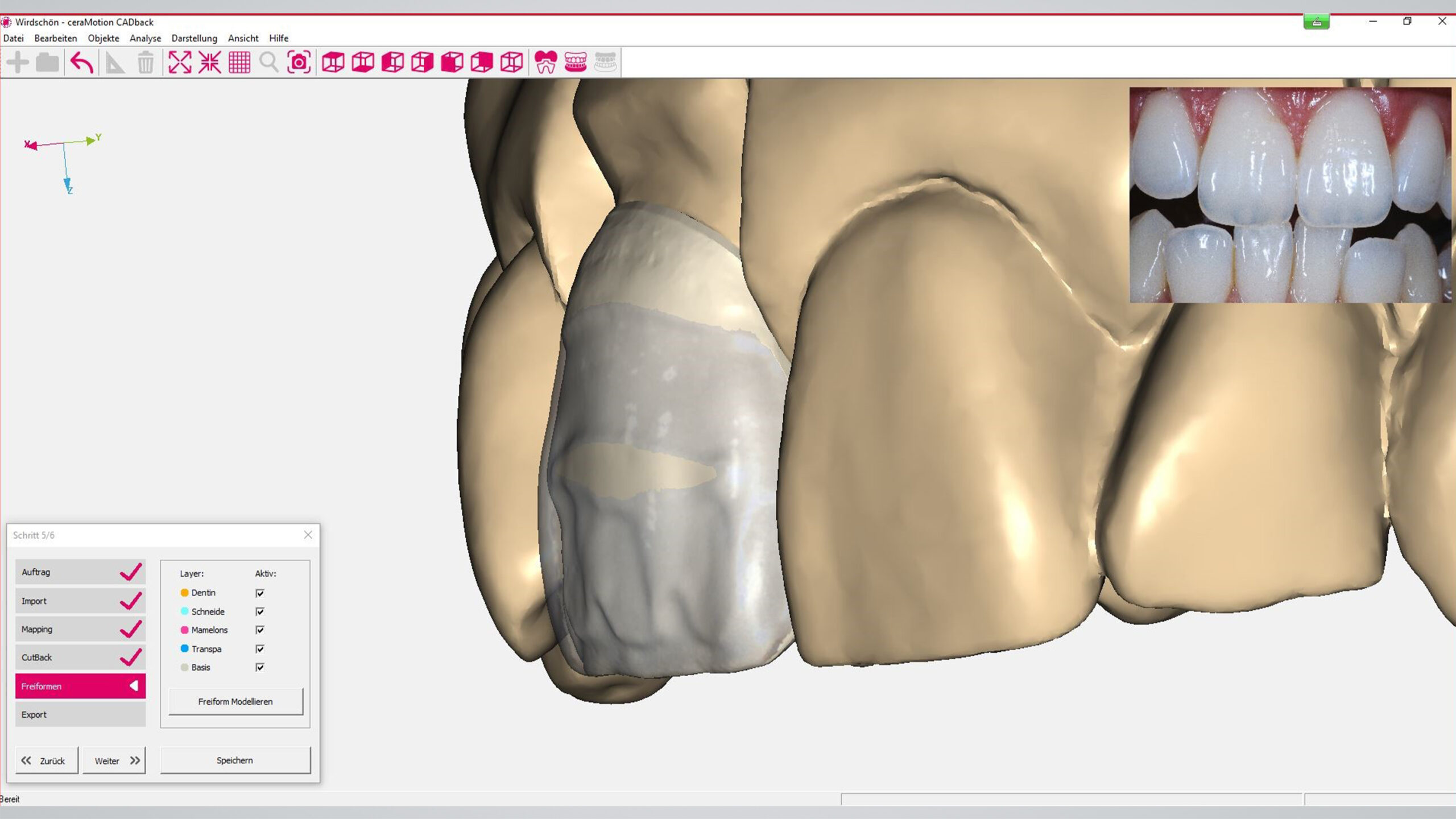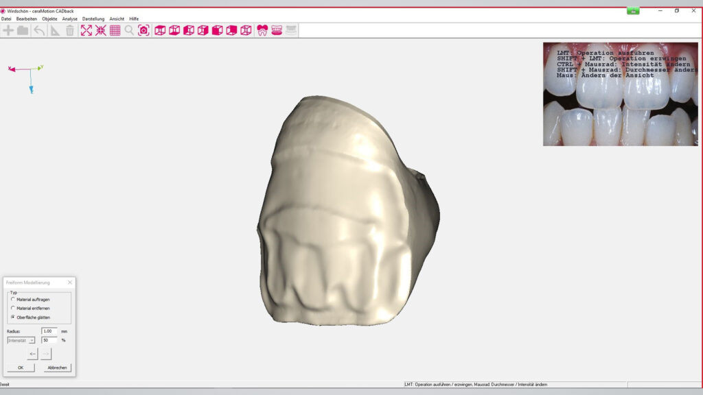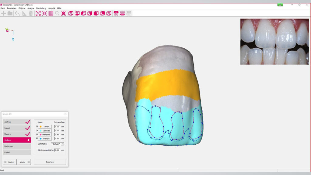 ceraMotion CADback (Dentaurum) ist als eigenständige Software für das Gerüstdesign konzipiert. Sie ermöglicht es dem Keramiker, aktiv in die digitale Gerüstgestaltung einzusteigen. Mit der pfiffigen Software gestaltet er das Gerüstdesign selbst. Anhand der vollanatomischen Vorlage (CAD-Datensatz) wird das digitale Gerüst an das individuelle Schichtschema angepasst, intuitiv wie die Bildbearbeitung auf dem Smartphone. Dank offener Softwarearchitektur sind alle Werkzeuge und Funktionen für das Cut-back mühelos zu bedienen – ohne Konvertierung des Dateiformats, ohne aufwendige Abstimmung mit der CAD-Abteilung, ohne umfangreiche CAD-Kenntnisse. Einfach die vorbereitete STL-Datei nehmen, Reduktionszonen definieren, Gerüst-Design erstellen. Fertig! Ein Color-Mapping unterstützt optional bei der realistischen Visualisierung von Zahnfarbbereichen.