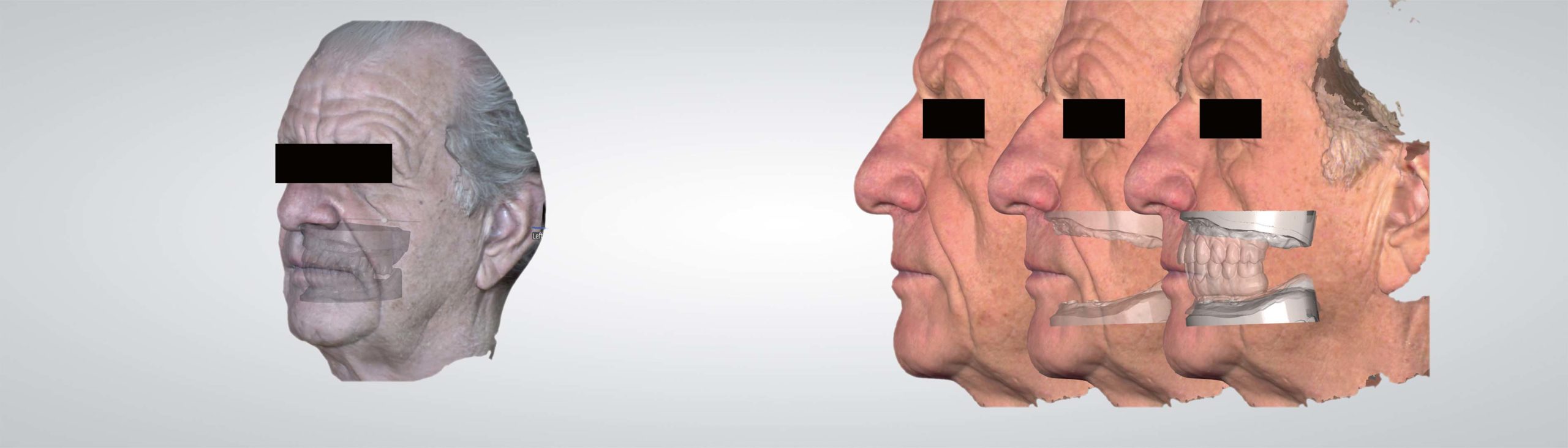 Zur Vorbereitung der Gesichtsanalyse wurden diverse Fotoaufnahmen angefertigt (Abb. 2) sowie eine 3-D-Digitalisierung des Gesichts mit dem Gesichtsscanner Face Hunter vorgenommen. Die in den Gesichtsscan eingeblendeten Situationsmodelle offenbaren die hohe vertikale Dimension, die mit dem Zahnersatz überbrückt werden müsste (Abb. 3). Der Kieferkamm im Oberkiefer ist stark atrophiert. Die Okklusionsebene im Unterkiefer fällt nach dorsal ab. Jeder Eingriff in das stomatognathe System nach Abschluss des Wachstums (zum Beispiel mit Zahnersatz oder Kieferorthopädie) wird vom Körper an anderer Stelle kompensiert. Dafür können sieben Ausgleichspunkte definiert werden (von lateral: für die Kopfvor- und -rückhalte; von frontal: für die Rotation) [1].