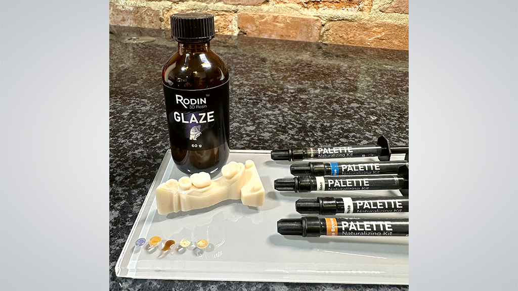 Das 3D-Druckharz Rodin Sculpture wird mit einem speziell entwickelten Malfarben- und Glasursystem, der Rodin-Palette, geliefert. Die Malfarben können passend zur umgebenden Zahnsubstanz aufgetragen werden. Nach der Lichthärtung der Malfarben wird die Rodin-Glasur aufgetragen und in einer Hochintensitäts-Lichtkammer unter Stickstoffatmosphäre gehärtet, um einen dauerhaften Halt der Malfarben- und Glasurschichten zu gewährleisten. Die mit dem vorgestellten Kunststoff gedruckten Restaurationen lassen sich mit herkömmlichen Poliertechniken leicht auf Hochglanz polieren.