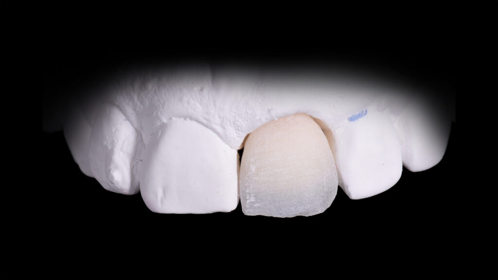 In diesem Artikel konzentrieren wir uns auf die Herstellung einer einzelnen Frontzahnkrone auf einem Zirkonoxidgerüst mit keramischen Werkstoffen von Kuraray Noritake. Im Laboralltag bevorzugen wir Katana Zirconia (Kuraray Noritake), da es sich aus unserer Sicht am besten bewährt hat. Als wichtige Erfolgsmerkmale sind die verlässliche Ergebnisqualität, die Festigkeit des Werkstoffs sowie die hohe Helligkeit bei gleichzeitig guter Lichtdynamik innerhalb der Restauration hervorzuheben. Unter der Bezeichnung „gute Lichtdynamik“ lässt sich eine fehlende Lichtblockung definieren, die eine hohe Opazität verursachen würde.