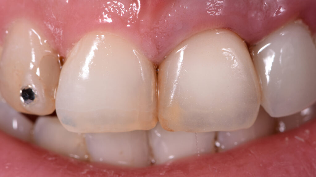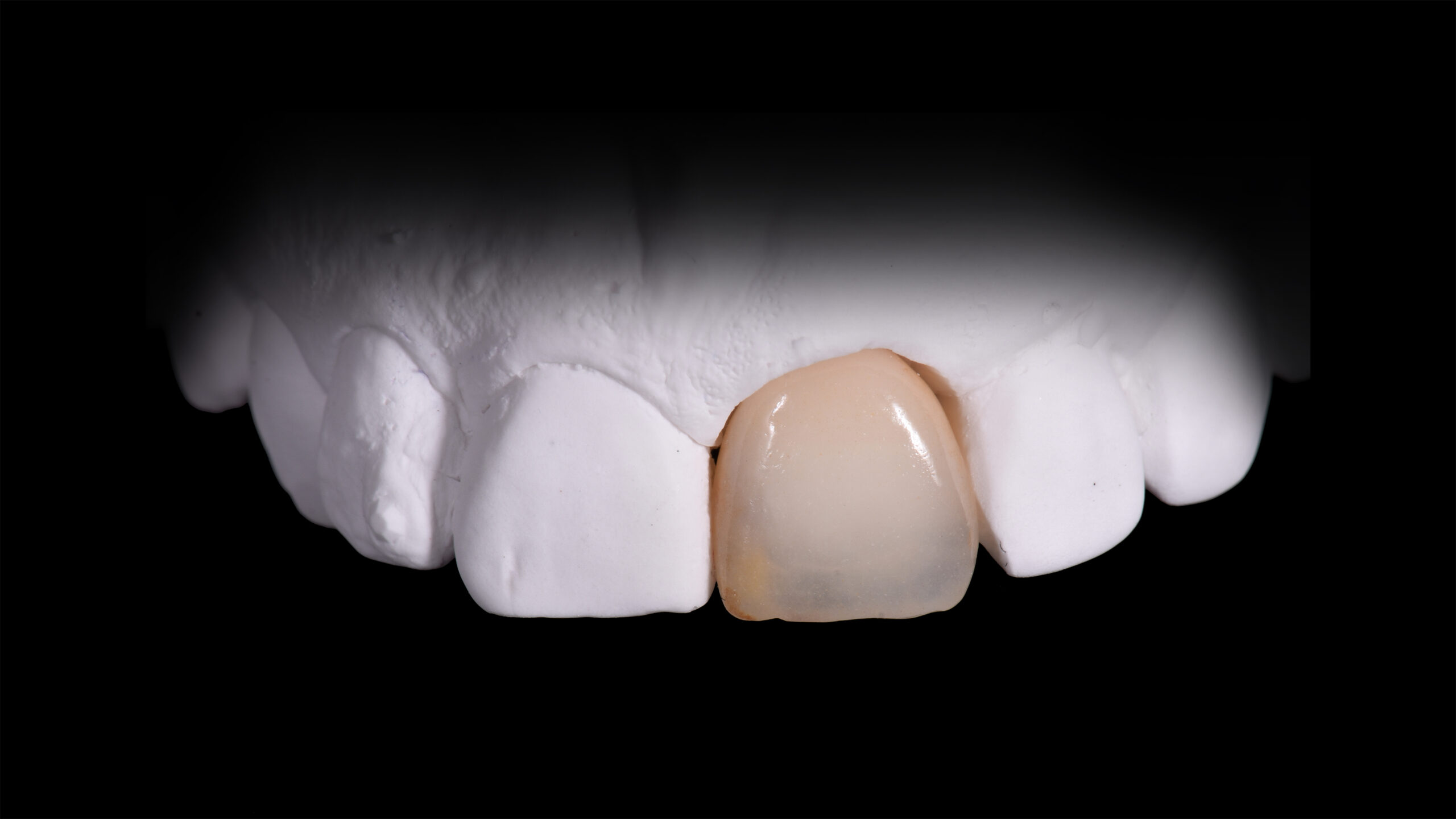 Die Abbildung 10 zeigt die eingesetzte vollkeramische Krone, die passend zum Nachbarzahn mit einer natürlichen Form und Lichtoptik beeindruckt. Es konnte ein lebendiges, internes Farbspiel erzeugt werden. Die ausgewogene Transluzenz und Opazität resultieren aus dem Gerüstmaterial in Kombination mit dem Schichtschema.