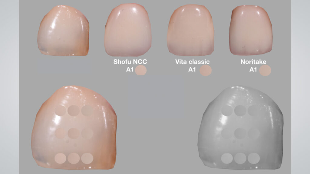 Beim Vergleich der Farbmuster mit dem natürlichen Zahn wurde deutlich, dass die A1 Shofu NCC-Probe im mittleren Teil des Zahnes sehr gut harmoniert. Durch das Überführen des Fotos in die Schwarz-Weiß-Darstellung konnten wir feststellen, dass die Helligkeit des Musters dem anzustrebenden Ergebnis entspricht (Abb. 2).