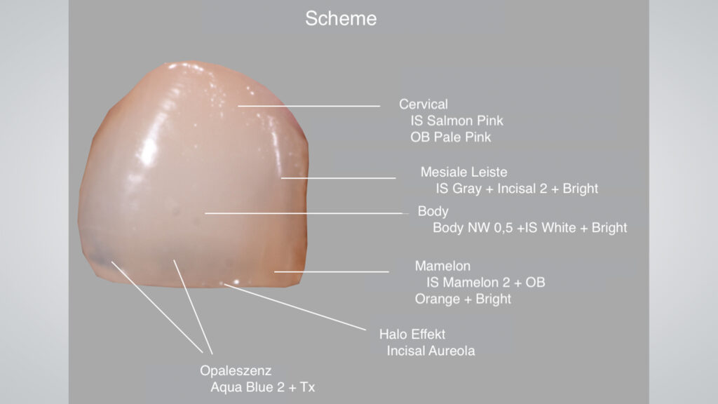 Aus den Beobachtungen der Farbanalyse lassen sich Rückschlüsse auf die Wahl der keramischen Massen für die Schichtung ziehen; die Grundlage für das Schichtkonzept (Abb. 3). In diesem Fall sollte für den Dentinkörper die Masse NW 0,5 aus dem Verblendkeramik-Sortiment Cerabien ZR (Kuraray Noritake) dienen. Im zervikalen Teil wurde in der Software eine erhöhte Rotsättigung festgestellt. Diesen Effekt können wir auf vielfältige Weise erzielen, zum Beispiel mit dem Bemalen des Zirkonoxidgerüstes vor dem Sintern (zum beispiel Esthetic Colorant, Kuraray Noritake), der Internal-Stain-Technique (Bemalen des Gerüstes) mit Salmon Pink IS Internal Malfarben (Cerabien ZR) oder mit modifizierten Dentinmassen unter Zugabe von OD Pale Pink (Cerabien ZR). Anpassungen der Luminanz oder interne Effekte wie Mamelon können mit Noritake Live Internal Stain (Cerabien ZR) nachgebildet werden. Diese Massen haben die Fähigkeit, Licht zu transportieren, wodurch natürlich aussehende, innere Zahnstrukturen entstehen können. Im Set gibt es auch eine spezielle transparente Masse (Bright). Damit lassen sich die Transparenz erhöhen und die Farbsättigung etwas reduzieren, um natürlichere Farbtöne zu erhalten. Diese Masse wird daher bei uns für nahezu allen Schichtungen verwendet. Nach der Analyse des Fotos und dem Aufstellen des Schichtschematas wurde das Zirkonoxidgerüst als Grundlage für die Umsetzung der Schichtung hergestellt.