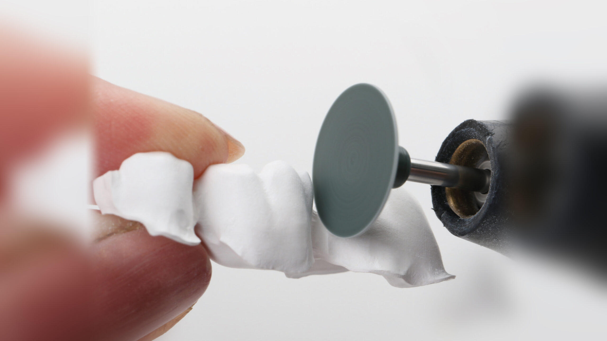 Bestes Beispiel ist der Gummi UFO, mit ihm lässt sich zwischen den Brückengliedern noch ein wenig Platz schaffen. Zu diesem Zweck kann der Gummi am Abziehstein verjüngt werden, bis eine hauchdünne Scheibe entsteht. Mit den spitz zulaufenden Gummis kann okklusal finalisiert werden. Insbesondere lassen sich die Kauflächen auf diese Weise deutlicher darstellen. Die anderen Formen dienen hauptsächlich dazu, die Ränder etwas dünner zu gestalten oder auch dazu, die Supports zu verschleifen.