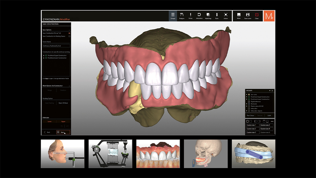 Das Florence Totalprox Denture System (Abb. 4) bietet eine präzise und ästhetische Lösung für die digitale Herstellung von Totalprothesen. Mit der leistungsstarken Software Zirkonzahn.Modifier, den nahezu monomerfreien Materialien Abro Basic Multistratum für Prothesenzähen und Denture Gingiva Basic Mono für Prothesenbasen sowie einer neuartigen Methode des Verklebens mit Polibond ermöglicht das System eine schnelle und digitale Anfertigung von Totalprothesen, die sich durch ihre hohe Passgenauigkeit und Langlebigkeit auszeichnen. Es kombiniert fortschrittliche Technologien mit handwerklichem Können, um ein optimales Ergebnis zu erzielen, das sowohl ästhetisch ansprechend als auch funktional ist. Mit der neu entwickelten Software Zirkonzahn.CAM High-Speed kann durch optimierte Fräszeiten eine Totalprothese (OK/UK) in ca. zwei Stunden und 40 Minuten gefräst werden. Zudem wurden auch die Berechnungs- und Nesting-Zeiten sowie die Fräszeiten für Kronen, Schienen und weitere Anwendungen erheblich verkürzt.