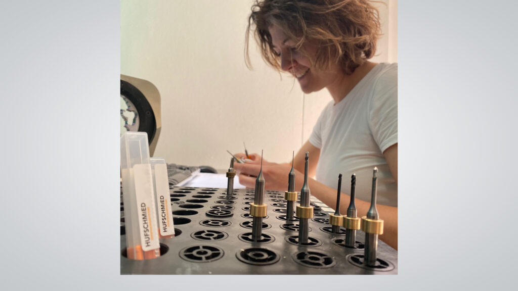 „Michael Mödinger hat uns über etwa ein viertel Jahr immer wieder besucht und uns geholfen die Parameter zu optimieren“, berichtet Melanie Keller, die Zahntechnikerin, die sich bei goodBionics zur CAD/CAM-Spezialistin entwickelt hat: „Wir haben auch Standzeittests durchgeführt und wissen daher sehr genau, wie lange wir die Hufschmied-Werkzeuge jeweils einsetzen können.“