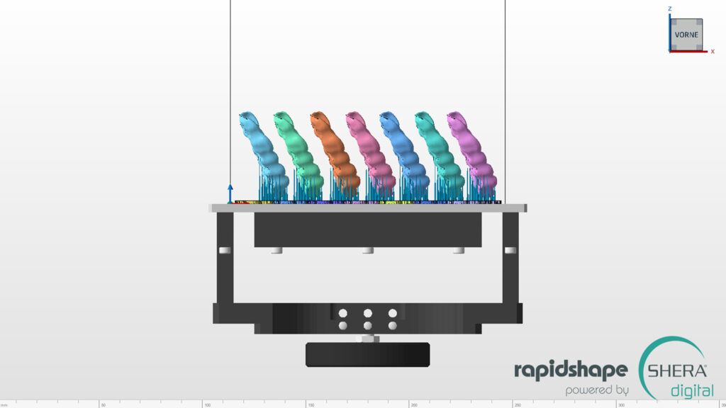 Mit einer Layerstärke von 100 μm werden die Schienen hochkant gedruckt. Shera empfiehlt, die Schienen mit einem Neigungswinkel von circa 60 Grad auf dem Frontzahnbereich ruhend auf der Bauplattform zu nesten. So liegt der Schwerpunkt der Schiene mit dem größten Materialbedarf unten. Insgesamt werden so weniger und kürzere Supports benötigt als beim Druck von Schienen, die andersherum auf der Bauplattform angeordnet sind. Damit die Flächen auf der Schiene mit Kontakt zum Gegenkiefer möglichst nicht geschliffen werden müssen, sollten Supports nicht okklusal gesetzt werden. Dies verringert den Aufwand beim ­Nachbearbeiten, aber vor allem die Gefahr, die Okklusionskontakte ungewollt zu ­verändern.