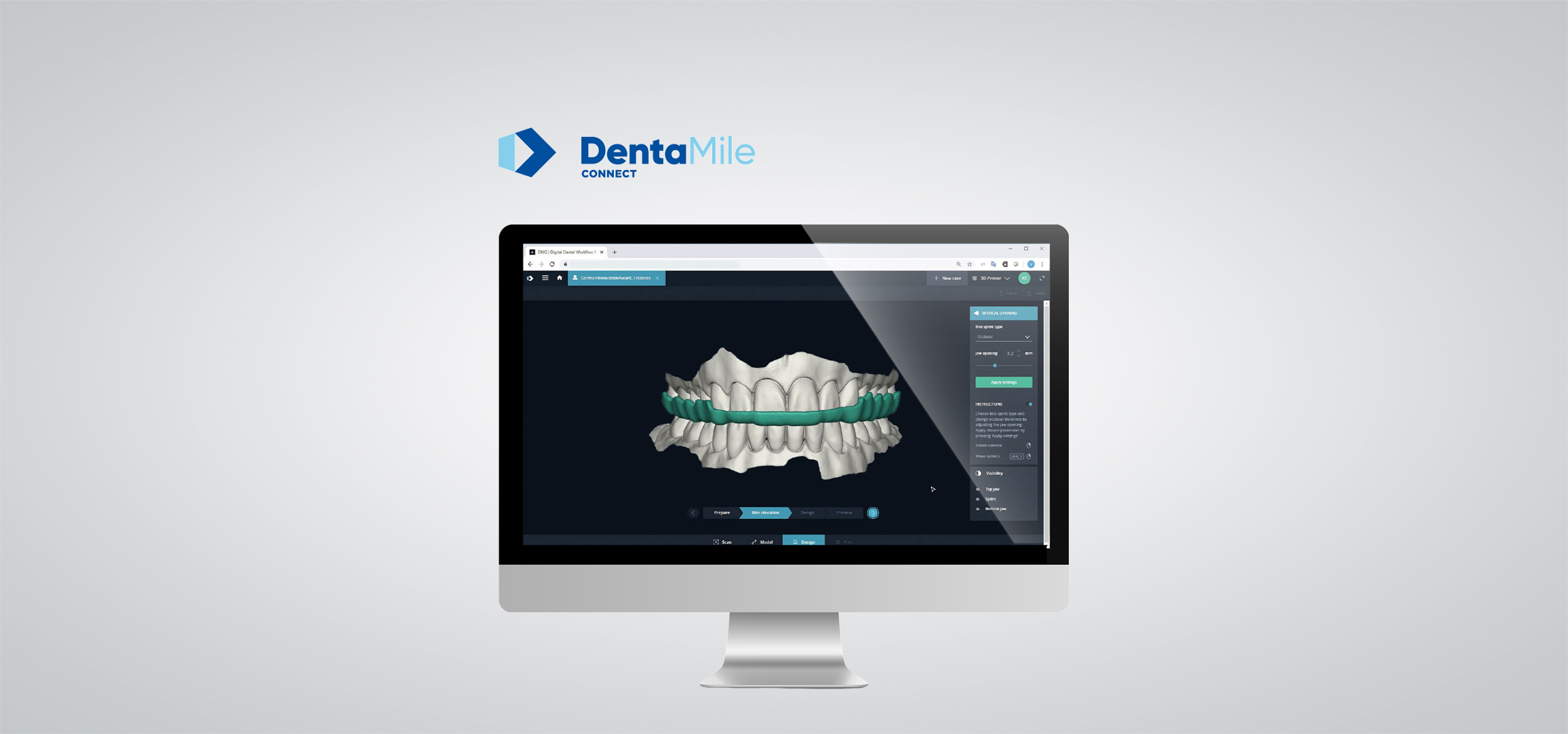 Die von DMG entwickelte, innovative cloudbasierte Softwarelösung sorgt für einen abgesicherten und validierten Workflow zur Herstellung von Medizinprodukten im additiven Verfahren. Selbst 3D-Drucken? Mit einem Zahnarzt oder einem Partnerlabor vernetzen? Nur scannen? Oder auch digital gestalten? Egal wie, man kann am digitalen Workflow teilhaben. Die flexiblen Nutzungsoptionen der preisgekrönten DentaMile connect Software bietet alle Möglichkeiten. Der Anwender entscheidet, was er tun möchte – und welches Modell das richtige für seinen Bedarf ist. Mit wenigen Klicks kann man Scans versenden, auf deren Basis ganz einfach in DentaMile connect Designs erstellt und anschließend Objekte im 3D-Druck produziert werden können.
