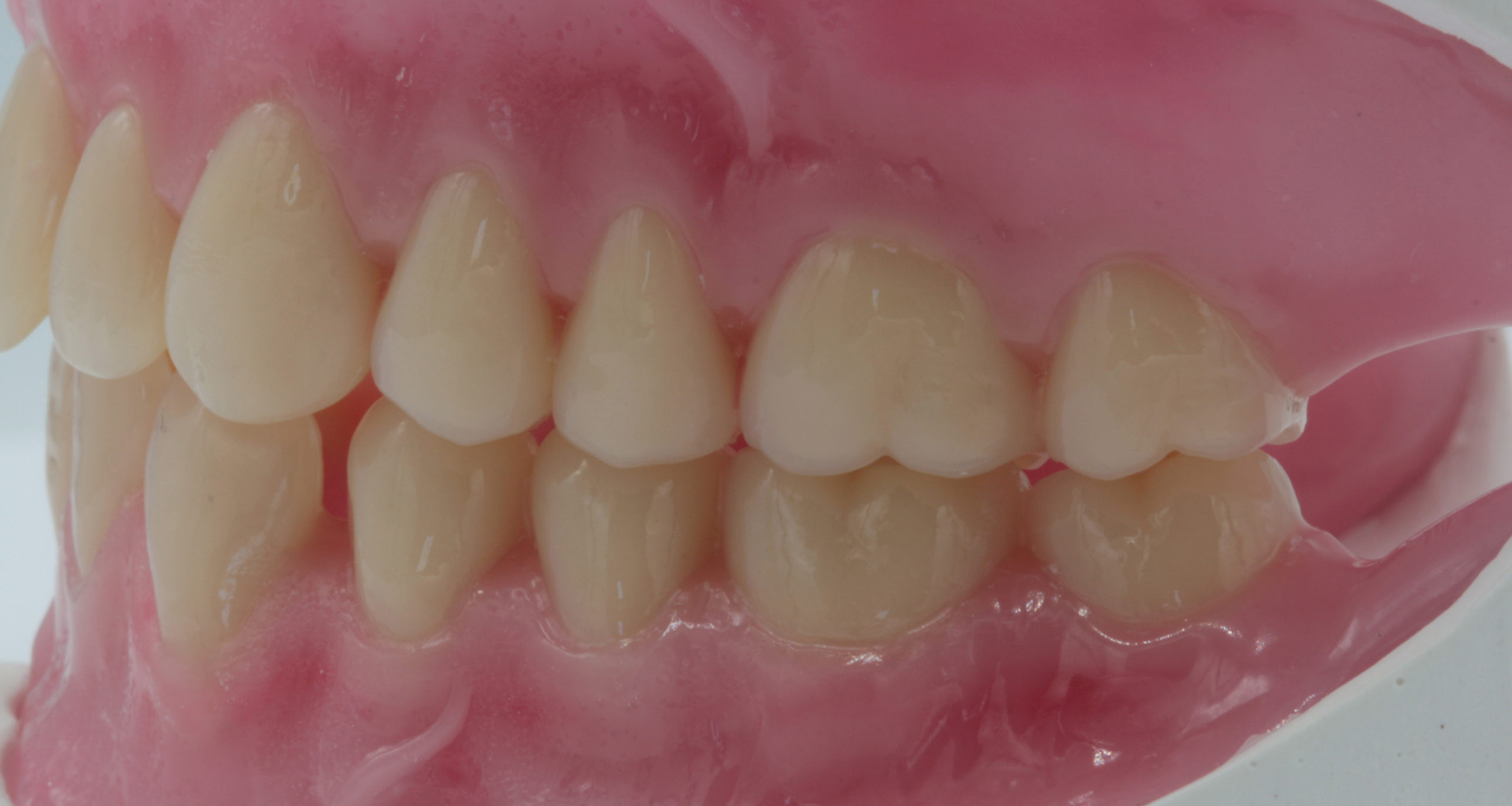 Beim Polystar Selection life ist die Zahn-zu-Zahn Beziehung nicht so deutlich zu erkennen (Abb. 02), da die Zähne eine Besonderheit aufweisen. Die Okklusionskontakte sind in Zahn-zu-Zahn Beziehung, aber betrachtet man diese von bukkal, sieht die Aufstellung wie bei einer Zahn-zu-zwei-Zahn Beziehung aus. Dadurch erscheint es eher wie eine geschlossene Verzahnung und wird als Zahn-zu-zwei-Zahn Aufstellung wahrgenommen.