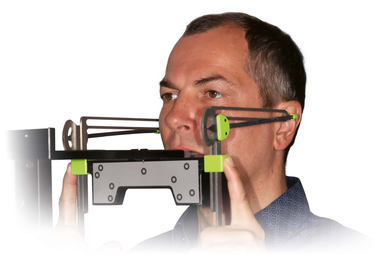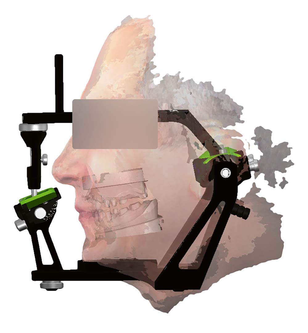 Die korrekten Ebenen werden dazu mit dem PlaneSystem (Udo Plaster, Zirkonzahn) erfasst. Hierbei handelt es sich um einen extraoralen Gesichtsbogen auf einem Stativ (PlaneFinder, Zirkonzahn) zur Erfassung der natürlichen Kopfhaltung für die Ist-Analyse der Okklusionsebene. Eine zweite Messung ergibt den Okklusionslinienwinkel (Ala-Tragus-Linie) zur Soll-Situation mit Konstruktion der korrekten Kauebene (Abb. 3). So wurden die in zentrischer und erhöhter Bissposition hergestellten Table Tops auf die Unterkiefer-Seitenzähne bis jeweils einschließlich zum unteren Eckzahn aufgeklebt. Frontzahnkontakte sollen in dieser Phase bewusst vermieden werden, um eine retrale Zwangsposition mit Druck auf die Kiefergelenke zu vermeiden. Mit dieser therapeutischen Schiene lässt sich eine korrekte Front-Eckzahnführung etablieren (Abb. 4a bis c). Zudem ergab sich in diesem Behandlungsfall durch die Bisshebung und die fehlenden Frontzahnkontakte erst die notwendige Weiterbehandlungsoption für die OK-Frontzähne.