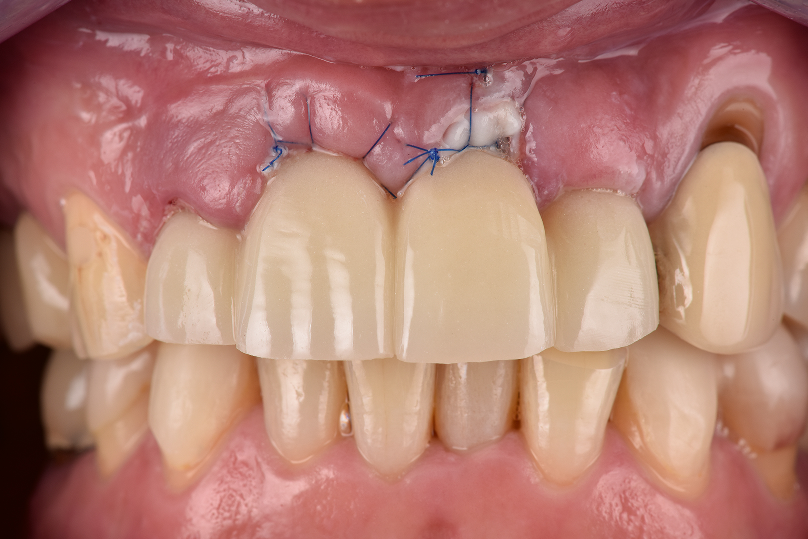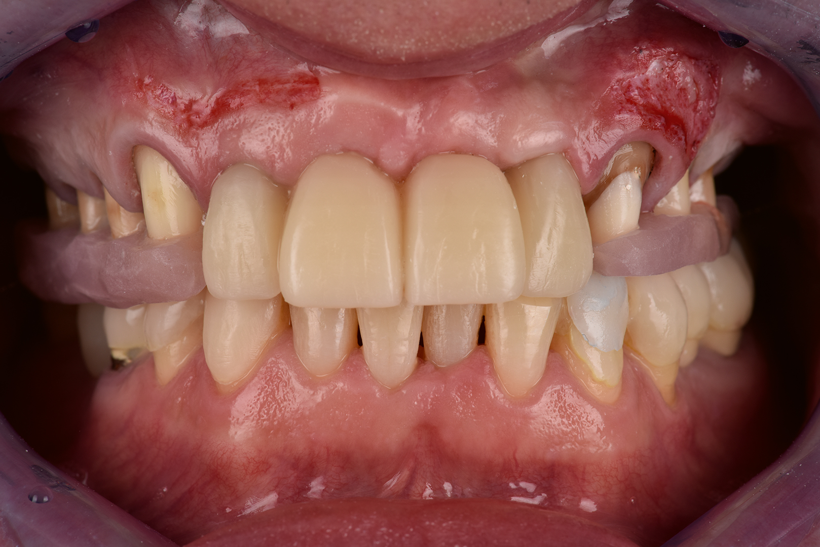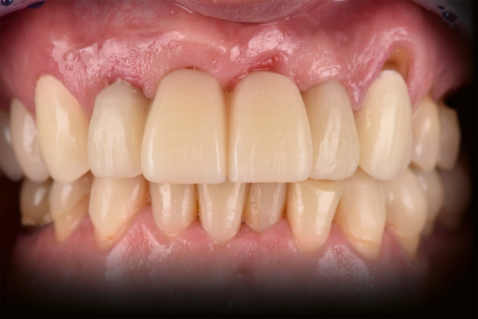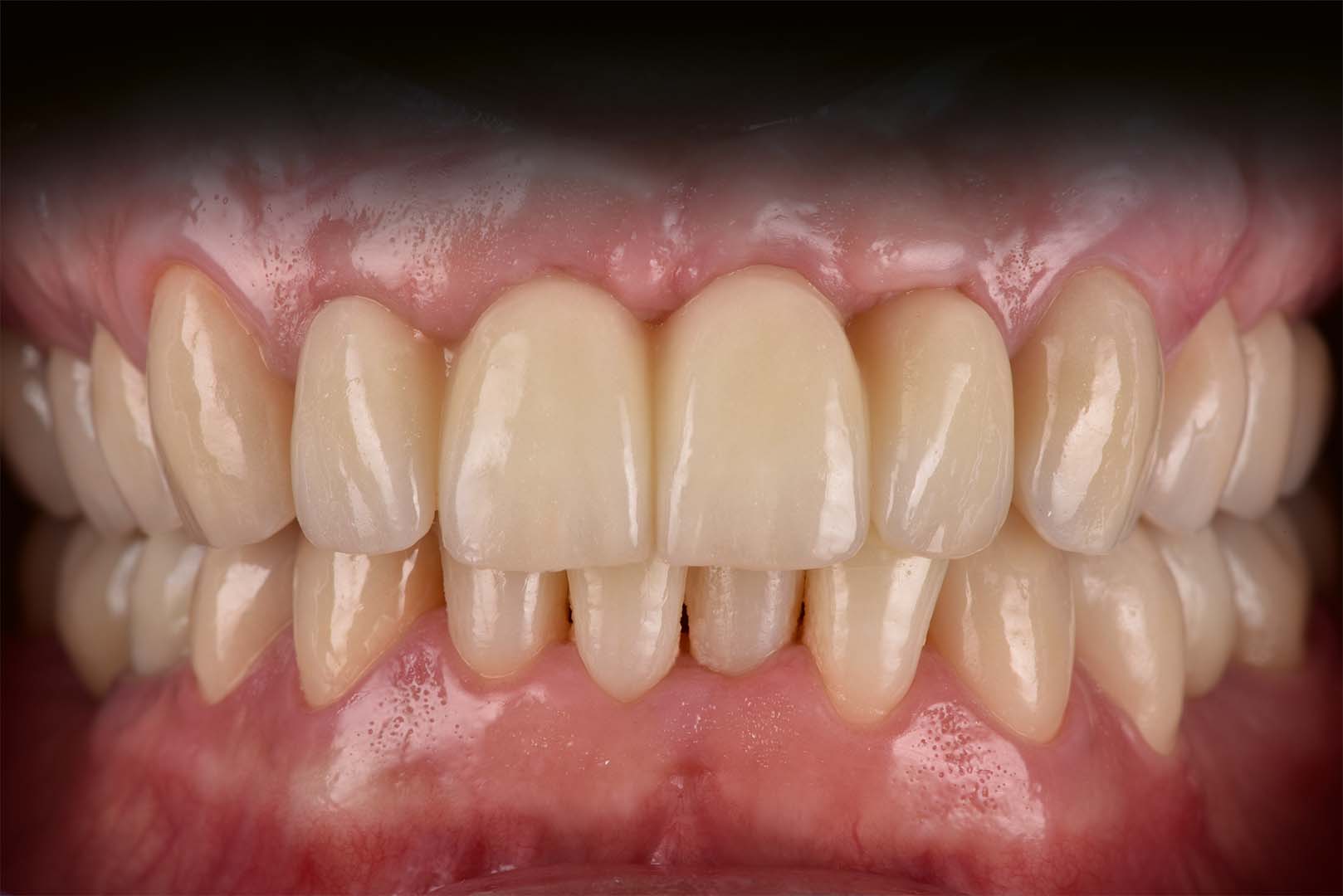 Eine Alternative zu der Abdeckung der augmentierten Extraktionsalveolen der Zähne 11 und 21 mit der Kollagenmembran ist der Verschluß durch Bindegewebetransplantate mit Epithel. Diese werden aus dem Gaumen mit Trepanen der entsprechenden Größe entnommen und dann exakt vernäht. Dadurch ist ein weiterer Volumenerhalt zu erzielen und ein nachfolgender Aufbau der Pontics könnte vermieden werden. Entscheidender Faktor bei der Umsetzung in den definitiven Zahnersatz ist die korrekte Übertragung der gefundenen Bisshöhe und Relation. Okklusale Korrekturen an den Zirkonoxidkronen können nachfolgend nur schwer durchgeführt werden. Der Vorteil, der aus Prettau Zirkon hergestellten Arbeit, ist das Entfallen des Chippings der Keramikverblendung. Es werden nur die vestibulären, nicht kautragenden Bereiche verblendet. Dadurch ist die Arbeit sehr langlebig, nahezu verschleißfrei und eine erneute Abnutzung mit Bissabsenkung weitgehend ausgeschlossen. Wenn Okklusion und Artikulation richtig passen, ist eine Verschlechterung der funktionellen Problematik nicht zu erwarten, es wird aber grundsätzlich eine Aufbissschiene für nachts angefertigt, um die Gewebe beim nächtlichen Knirschen zu entlasten. Später können die Inzisalkanten der Unterkieferfrontzähne mit Kunststoff in der neuen Zahnfarbe aufgebaut werden. Alternativ kommen Veneers oder Kronen in Betracht, abhängig vom Abrasions- und kariösen Zerstörungsgrad der Zähne. Um die Langlebigkeit der neuen Kronen und Brücken zu gewährleisten, müssen diese reinigungsfähig gestaltet werden. Die Auflageflächen der Brückenglieder des sehr hochverdichteten Prettau Zirkons liegen an der Gingiva dicht an und weisen zudem praktisch keine Plaqueretention auf. Weiterhin sind die Interdentalräume jeweils mesial und distal für die Reinigung mit Interdentalbürsten gestaltet. Im Frontzahnbereich sind diese aus ästhetischen Gründen zum Verschluss der interdentalen Dreiecke enger als im Seitenzahnbereich, bei denen auch ein einfacheres Handling notwendig ist. Eine intensive Pflege zu Hause und regelmäßige Intensivreinigung durch das Prophylaxeteam bleiben dabei unentbehrlich.