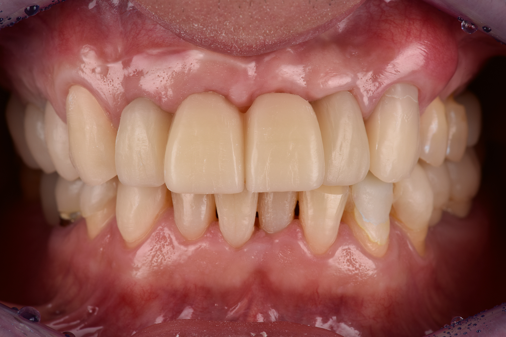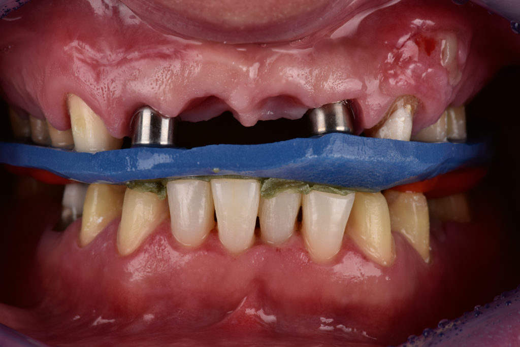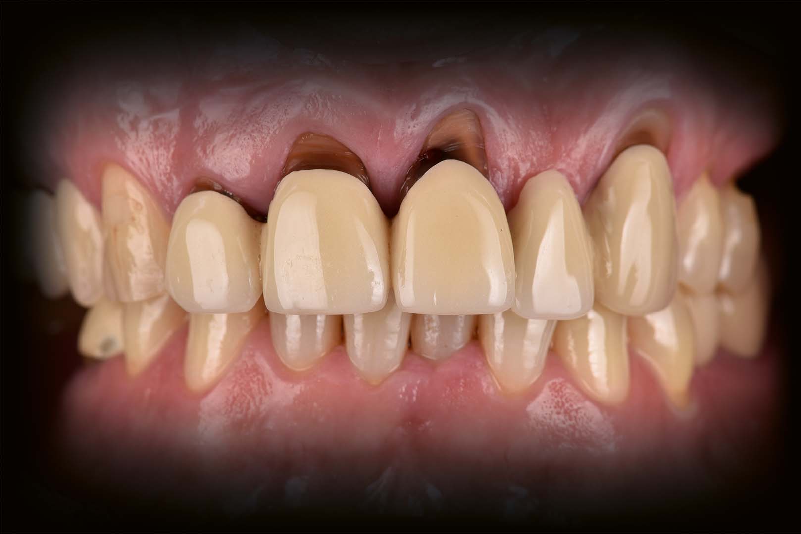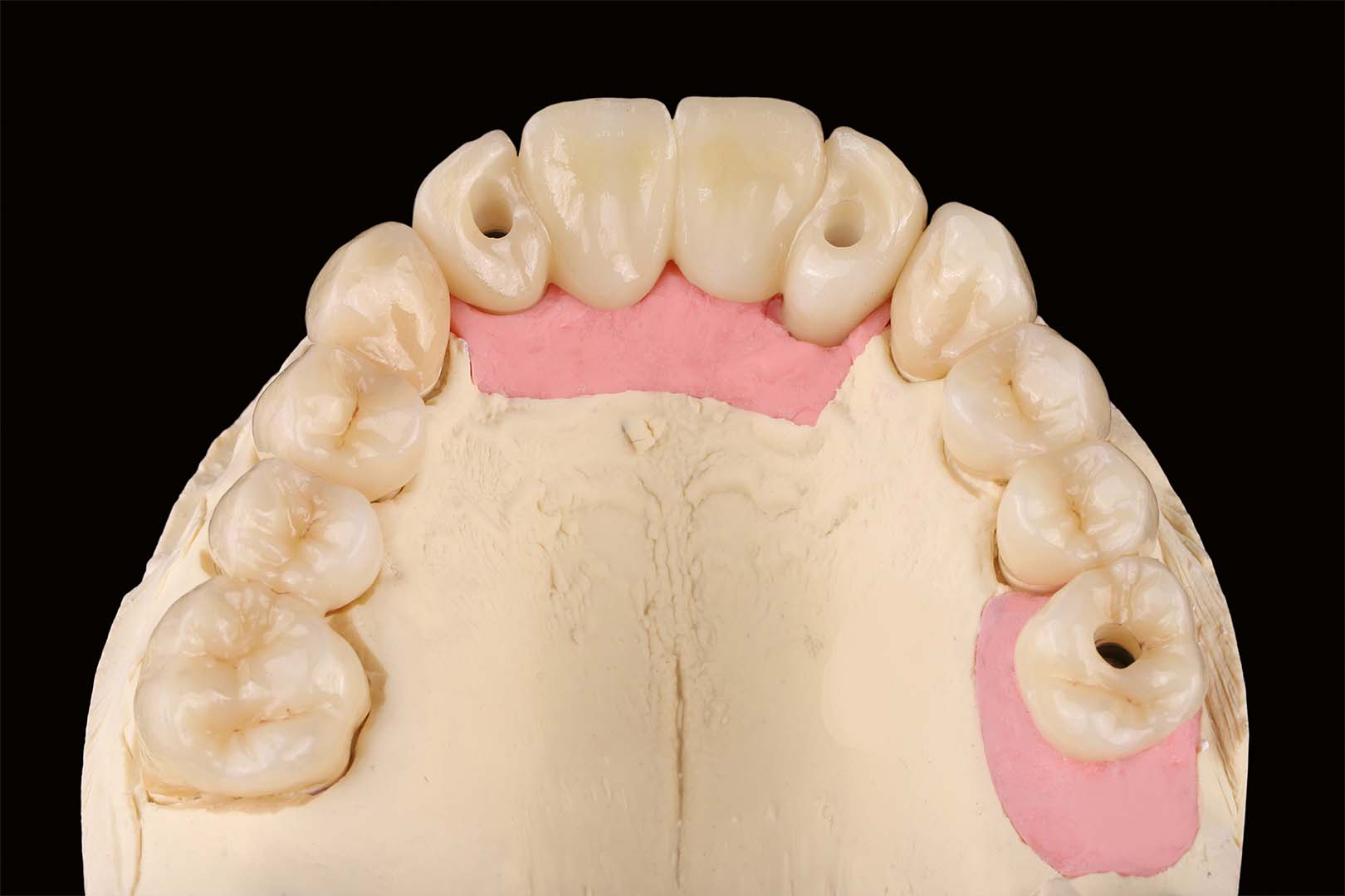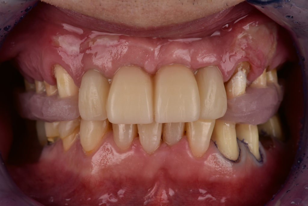 Eine Alternative zu der Abdeckung der augmentierten Extraktionsalveolen der Zähne 11 und 21 mit der Kollagenmembran ist der Verschluß durch Bindegewebetransplantate mit Epithel. Diese werden aus dem Gaumen mit Trepanen der entsprechenden Größe entnommen und dann exakt vernäht. Dadurch ist ein weiterer Volumenerhalt zu erzielen und ein nachfolgender Aufbau der Pontics könnte vermieden werden. Entscheidender Faktor bei der Umsetzung in den definitiven Zahnersatz ist die korrekte Übertragung der gefundenen Bisshöhe und Relation. Okklusale Korrekturen an den Zirkonoxidkronen können nachfolgend nur schwer durchgeführt werden. Der Vorteil, der aus Prettau Zirkon hergestellten Arbeit, ist das Entfallen des Chippings der Keramikverblendung. Es werden nur die vestibulären, nicht kautragenden Bereiche verblendet. Dadurch ist die Arbeit sehr langlebig, nahezu verschleißfrei und eine erneute Abnutzung mit Bissabsenkung weitgehend ausgeschlossen. Wenn Okklusion und Artikulation richtig passen, ist eine Verschlechterung der funktionellen Problematik nicht zu erwarten, es wird aber grundsätzlich eine Aufbissschiene für nachts angefertigt, um die Gewebe beim nächtlichen Knirschen zu entlasten. Später können die Inzisalkanten der Unterkieferfrontzähne mit Kunststoff in der neuen Zahnfarbe aufgebaut werden. Alternativ kommen Veneers oder Kronen in Betracht, abhängig vom Abrasions- und kariösen Zerstörungsgrad der Zähne. Um die Langlebigkeit der neuen Kronen und Brücken zu gewährleisten, müssen diese reinigungsfähig gestaltet werden. Die Auflageflächen der Brückenglieder des sehr hochverdichteten Prettau Zirkons liegen an der Gingiva dicht an und weisen zudem praktisch keine Plaqueretention auf. Weiterhin sind die Interdentalräume jeweils mesial und distal für die Reinigung mit Interdentalbürsten gestaltet. Im Frontzahnbereich sind diese aus ästhetischen Gründen zum Verschluss der interdentalen Dreiecke enger als im Seitenzahnbereich, bei denen auch ein einfacheres Handling notwendig ist. Eine intensive Pflege zu Hause und regelmäßige Intensivreinigung durch das Prophylaxeteam bleiben dabei unentbehrlich.
