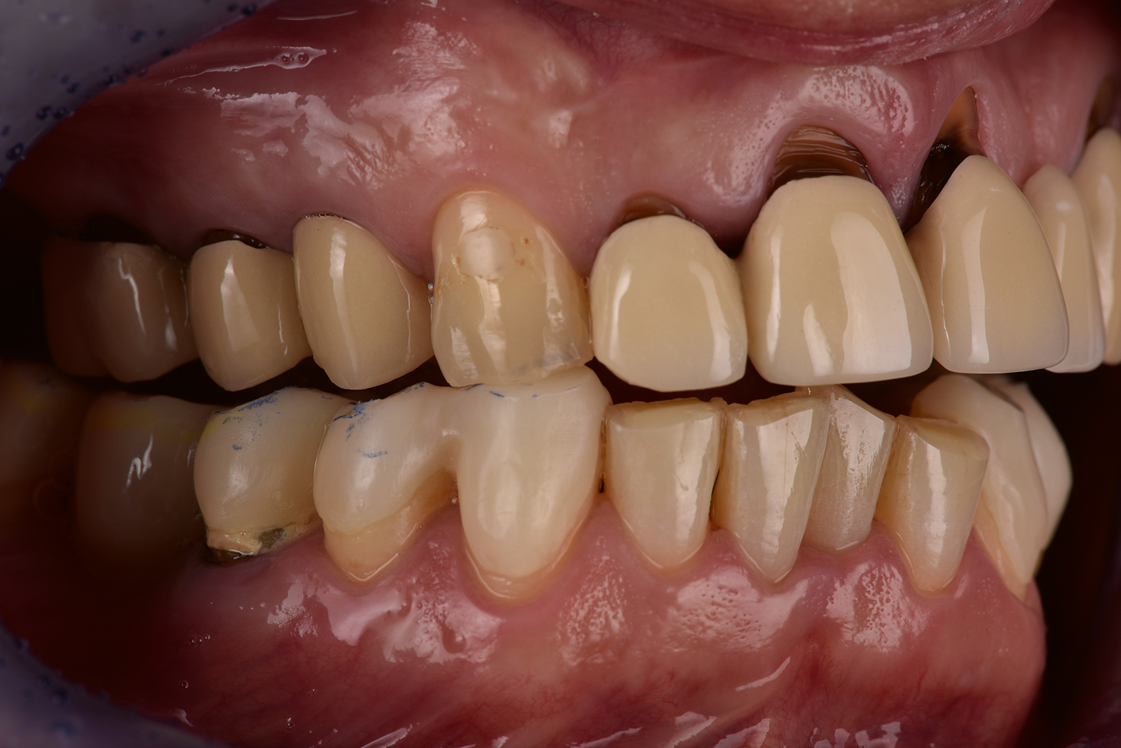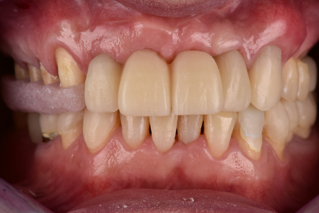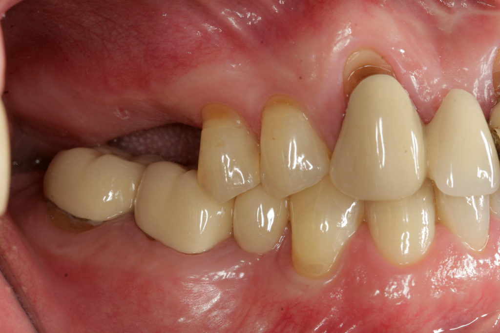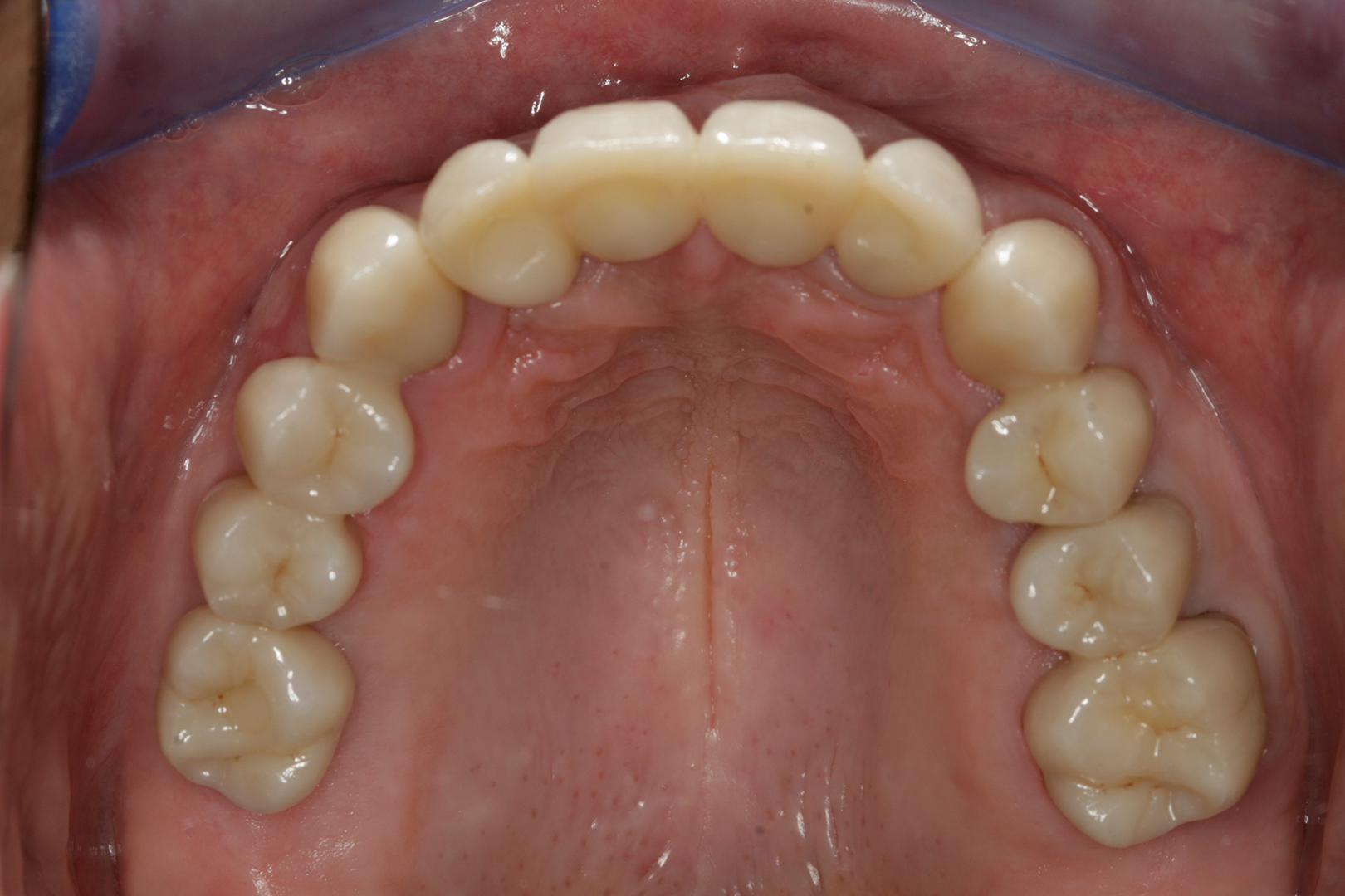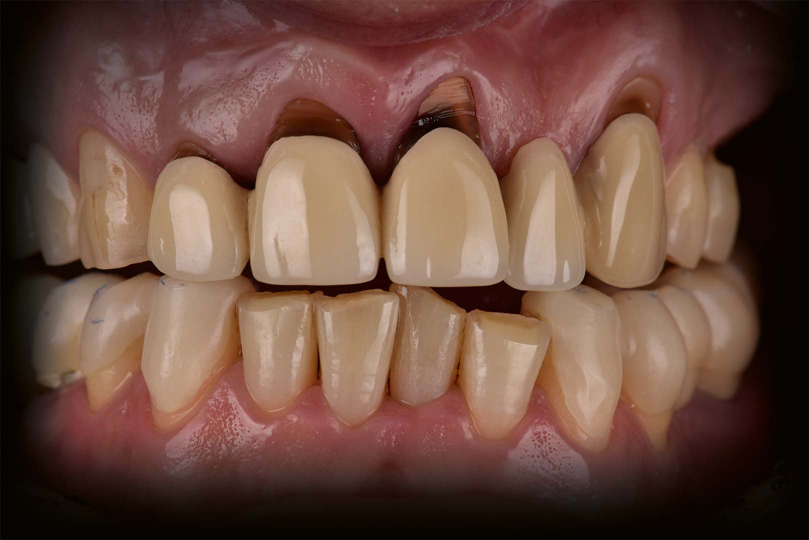 Eine Alternative zu der Abdeckung der augmentierten Extraktionsalveolen der Zähne 11 und 21 mit der Kollagenmembran ist der Verschluß durch Bindegewebetransplantate mit Epithel. Diese werden aus dem Gaumen mit Trepanen der entsprechenden Größe entnommen und dann exakt vernäht. Dadurch ist ein weiterer Volumenerhalt zu erzielen und ein nachfolgender Aufbau der Pontics könnte vermieden werden. Entscheidender Faktor bei der Umsetzung in den definitiven Zahnersatz ist die korrekte Übertragung der gefundenen Bisshöhe und Relation. Okklusale Korrekturen an den Zirkonoxidkronen können nachfolgend nur schwer durchgeführt werden. Der Vorteil, der aus Prettau Zirkon hergestellten Arbeit, ist das Entfallen des Chippings der Keramikverblendung. Es werden nur die vestibulären, nicht kautragenden Bereiche verblendet. Dadurch ist die Arbeit sehr langlebig, nahezu verschleißfrei und eine erneute Abnutzung mit Bissabsenkung weitgehend ausgeschlossen. Wenn Okklusion und Artikulation richtig passen, ist eine Verschlechterung der funktionellen Problematik nicht zu erwarten, es wird aber grundsätzlich eine Aufbissschiene für nachts angefertigt, um die Gewebe beim nächtlichen Knirschen zu entlasten. Später können die Inzisalkanten der Unterkieferfrontzähne mit Kunststoff in der neuen Zahnfarbe aufgebaut werden. Alternativ kommen Veneers oder Kronen in Betracht, abhängig vom Abrasions- und kariösen Zerstörungsgrad der Zähne. Um die Langlebigkeit der neuen Kronen und Brücken zu gewährleisten, müssen diese reinigungsfähig gestaltet werden. Die Auflageflächen der Brückenglieder des sehr hochverdichteten Prettau Zirkons liegen an der Gingiva dicht an und weisen zudem praktisch keine Plaqueretention auf. Weiterhin sind die Interdentalräume jeweils mesial und distal für die Reinigung mit Interdentalbürsten gestaltet. Im Frontzahnbereich sind diese aus ästhetischen Gründen zum Verschluss der interdentalen Dreiecke enger als im Seitenzahnbereich, bei denen auch ein einfacheres Handling notwendig ist. Eine intensive Pflege zu Hause und regelmäßige Intensivreinigung durch das Prophylaxeteam bleiben dabei unentbehrlich.