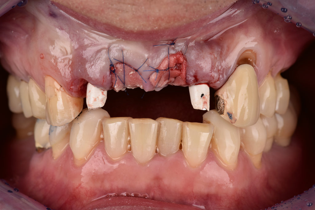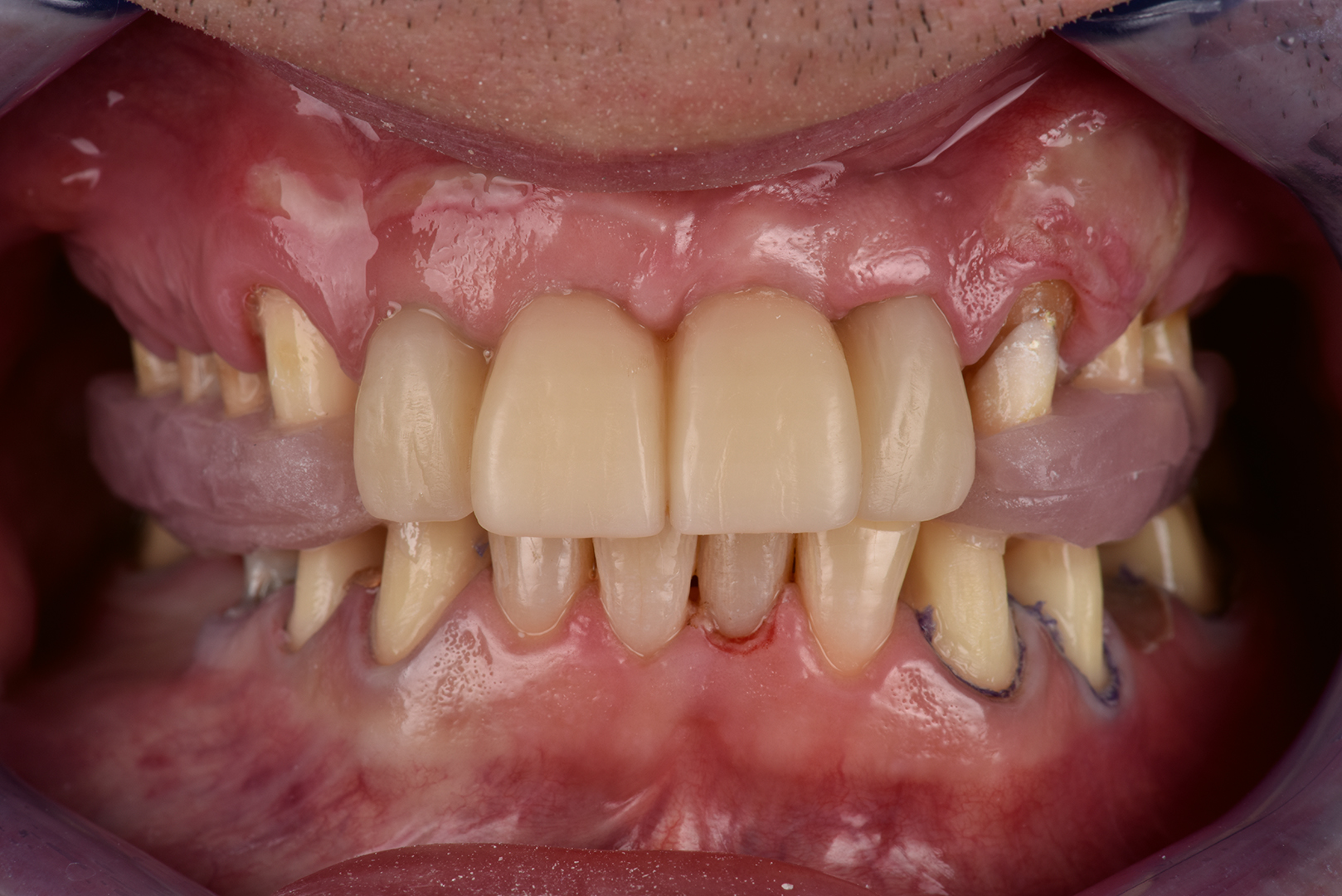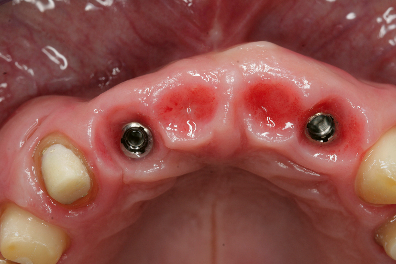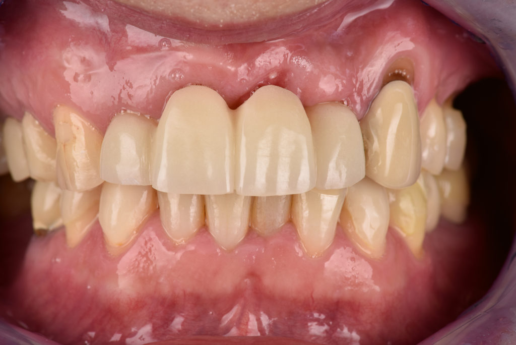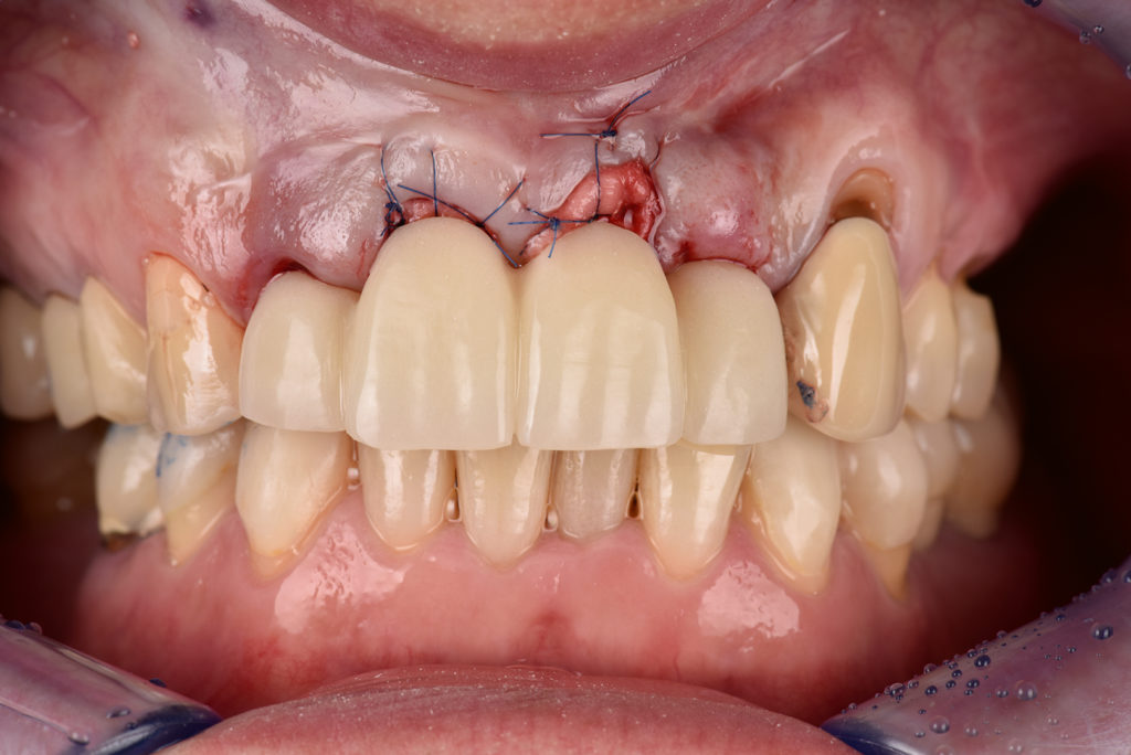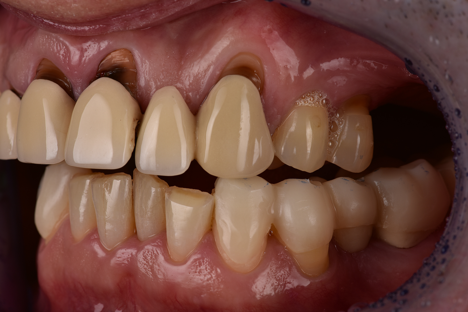 Eine Alternative zu der Abdeckung der augmentierten Extraktionsalveolen der Zähne 11 und 21 mit der Kollagenmembran ist der Verschluß durch Bindegewebetransplantate mit Epithel. Diese werden aus dem Gaumen mit Trepanen der entsprechenden Größe entnommen und dann exakt vernäht. Dadurch ist ein weiterer Volumenerhalt zu erzielen und ein nachfolgender Aufbau der Pontics könnte vermieden werden. Entscheidender Faktor bei der Umsetzung in den definitiven Zahnersatz ist die korrekte Übertragung der gefundenen Bisshöhe und Relation. Okklusale Korrekturen an den Zirkonoxidkronen können nachfolgend nur schwer durchgeführt werden. Der Vorteil, der aus Prettau Zirkon hergestellten Arbeit, ist das Entfallen des Chippings der Keramikverblendung. Es werden nur die vestibulären, nicht kautragenden Bereiche verblendet. Dadurch ist die Arbeit sehr langlebig, nahezu verschleißfrei und eine erneute Abnutzung mit Bissabsenkung weitgehend ausgeschlossen. Wenn Okklusion und Artikulation richtig passen, ist eine Verschlechterung der funktionellen Problematik nicht zu erwarten, es wird aber grundsätzlich eine Aufbissschiene für nachts angefertigt, um die Gewebe beim nächtlichen Knirschen zu entlasten. Später können die Inzisalkanten der Unterkieferfrontzähne mit Kunststoff in der neuen Zahnfarbe aufgebaut werden. Alternativ kommen Veneers oder Kronen in Betracht, abhängig vom Abrasions- und kariösen Zerstörungsgrad der Zähne. Um die Langlebigkeit der neuen Kronen und Brücken zu gewährleisten, müssen diese reinigungsfähig gestaltet werden. Die Auflageflächen der Brückenglieder des sehr hochverdichteten Prettau Zirkons liegen an der Gingiva dicht an und weisen zudem praktisch keine Plaqueretention auf. Weiterhin sind die Interdentalräume jeweils mesial und distal für die Reinigung mit Interdentalbürsten gestaltet. Im Frontzahnbereich sind diese aus ästhetischen Gründen zum Verschluss der interdentalen Dreiecke enger als im Seitenzahnbereich, bei denen auch ein einfacheres Handling notwendig ist. Eine intensive Pflege zu Hause und regelmäßige Intensivreinigung durch das Prophylaxeteam bleiben dabei unentbehrlich.