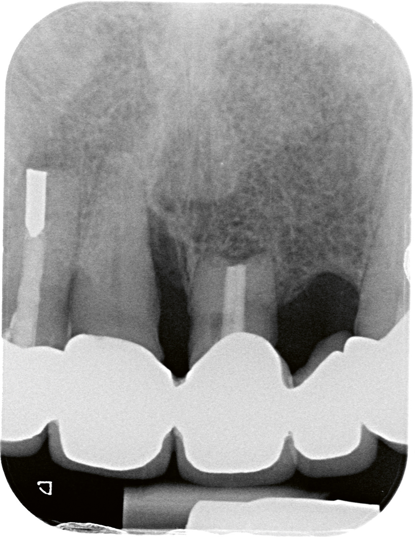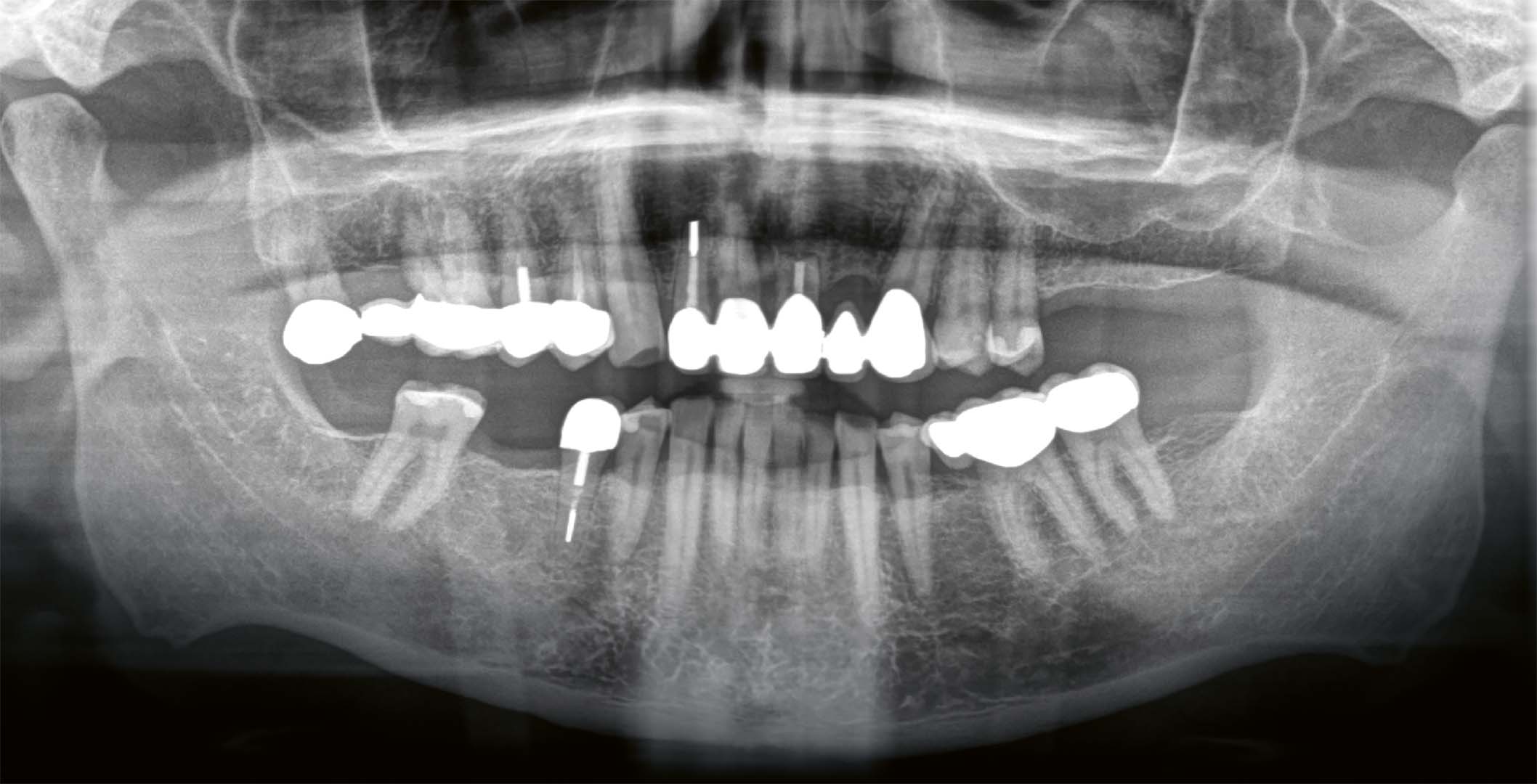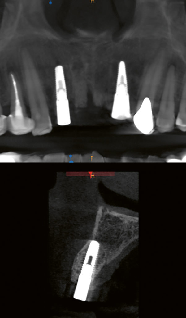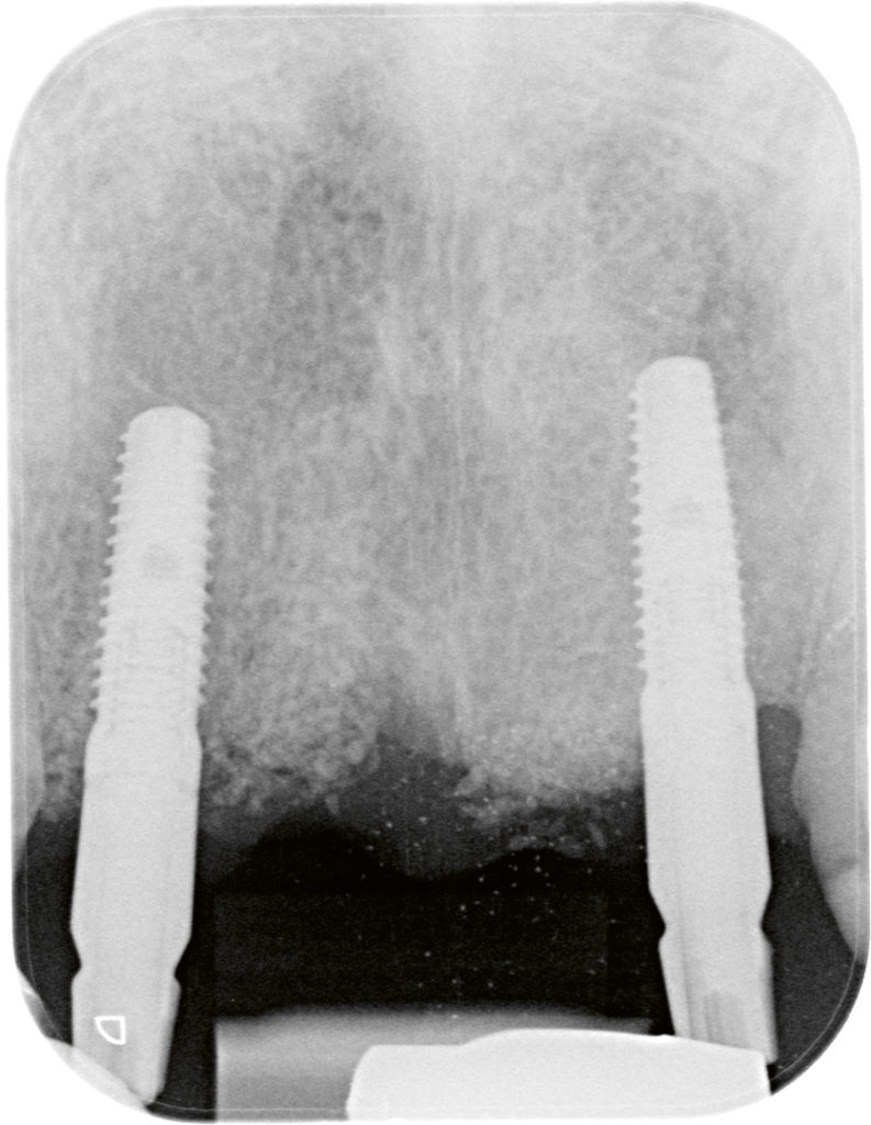 Die Oberkieferfrontzähne zeigten Taschentiefen bis 9 mm mit insgesamt einem deutlichen horizontalen sowie vertikalen Knocheneinbruch an Zahn 11. Weiterhin lagen ausgeprägte Rezessionen, vorangegangene Wurzelspitzenresektionen und apikale Aufhellungen vor (Abb. 5a und b). Deshalb wurde die Entfernung der Zähne 12 bis 21 beschlossen. Es sollten zwei Implantate (als Sofortimplantat) regio 12 und regio 22 inseriert und sofort festsitzend provisorisch versorgt werden. Zunächst wurde regio 26 ein Camlog Implantat mit einem externen Sinuslift inseriert. In einem zweiten OP-Termin wurden die Zähne 12 bis 21 entfernt, zwei Camlog-Implantate regio 12 und 22 inseriert und die Alveolen 12 bis 21 mit Osteo Biol mp3 (Tecnoss) aufgefüllt (Abb. 5c und d). Man beachte auf dem postoperativen DVT (Abb. 5d unten) die nach palatinal versetzte Positionierung des Implantates regio 12 (Größe 3,8 x 13 mm) und die vestibuläre Auffüllung der Extraktionsalveole. Zudem wurden die beiden Alveolen 11 bis 21 mit doppelt gelegten Bio-Gide Membranen (Geistlich Biomaterials) abgedeckt und vernäht. Dadurch sollte nur eine vorübergehende Stabilisierung des Augmentats erfolgen. Die beiden Implantate wurden mit PEEK-Abutments versehen, provisorisch beschliffen und ein vorbereitetes Schalenprovisorium hierüber unterfüttert. Die korrekte Positionierung wurde durch einen auf die Unterkieferzähne aufgesteckten und im Labor vorbereiteten kleinen Bissträger vereinfacht. Durch die zuvor aufgeklebten Table Tops konnten jegliche Kontakte auf den Frontzähnen zur Einheilung vermieden werden (Abb. 6a bis d). In der Abheilphase wurden die insuffizienten Wurzelfüllungen der Zähne 14 bis 16 revidiert (Abb. 7a und b).