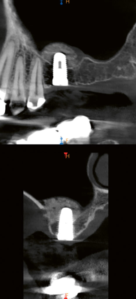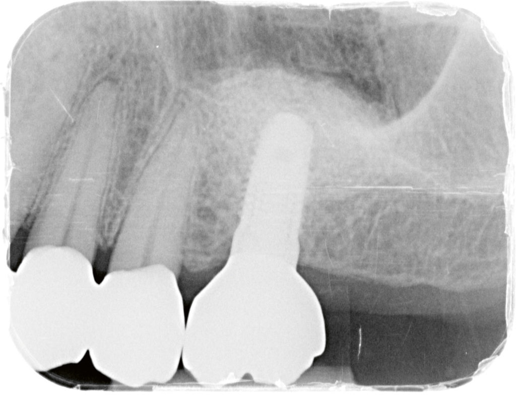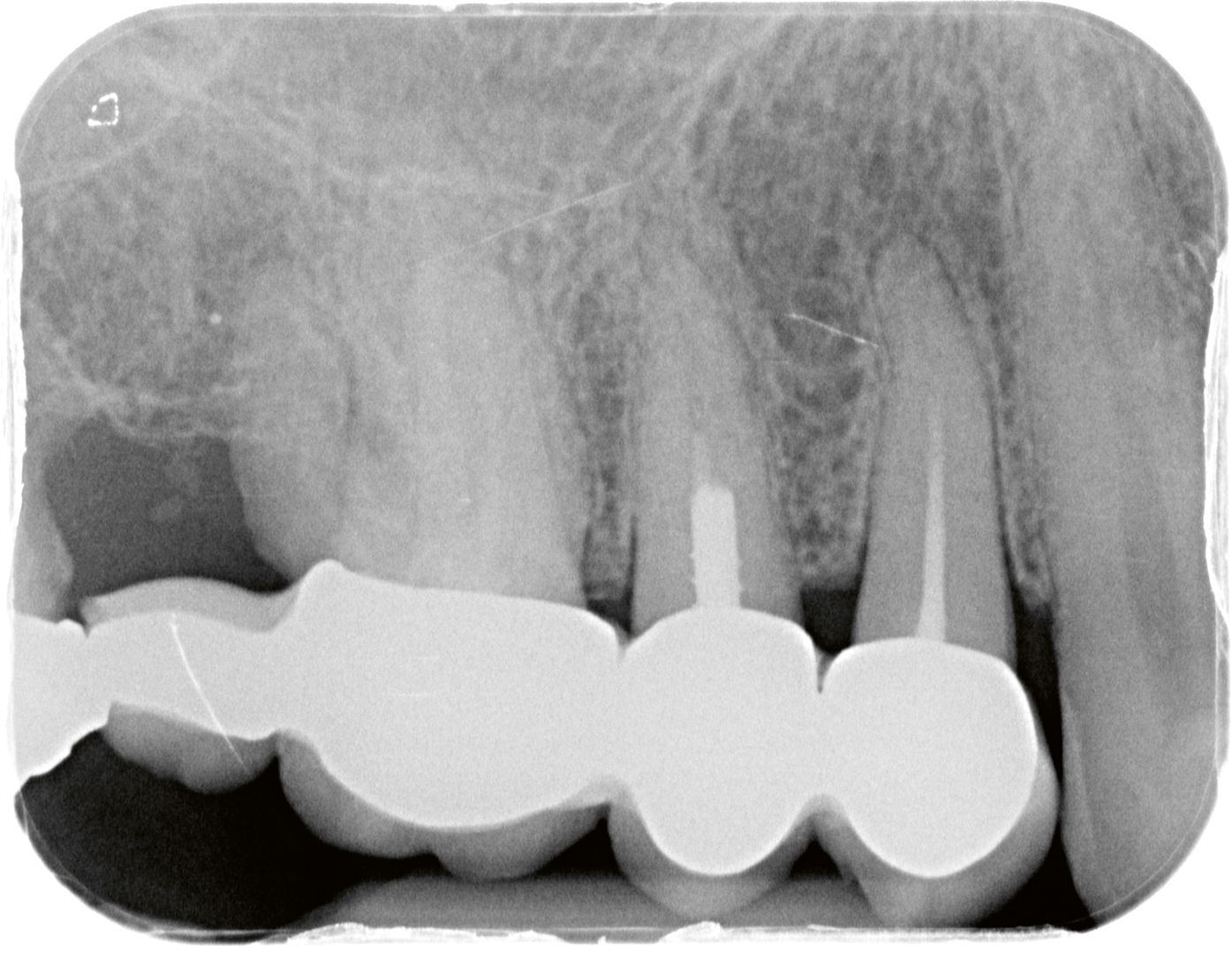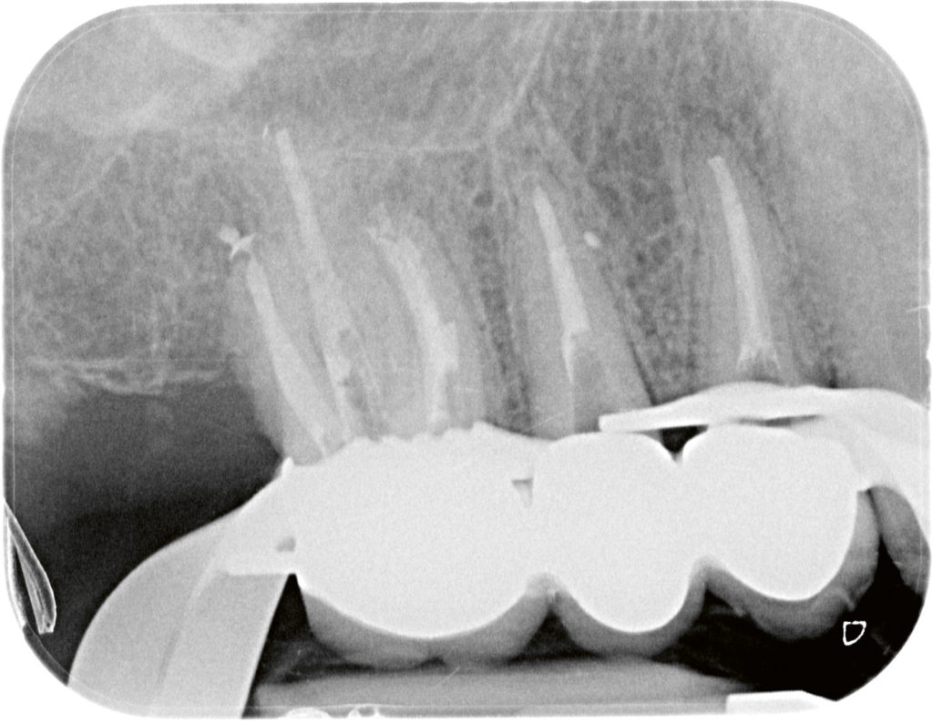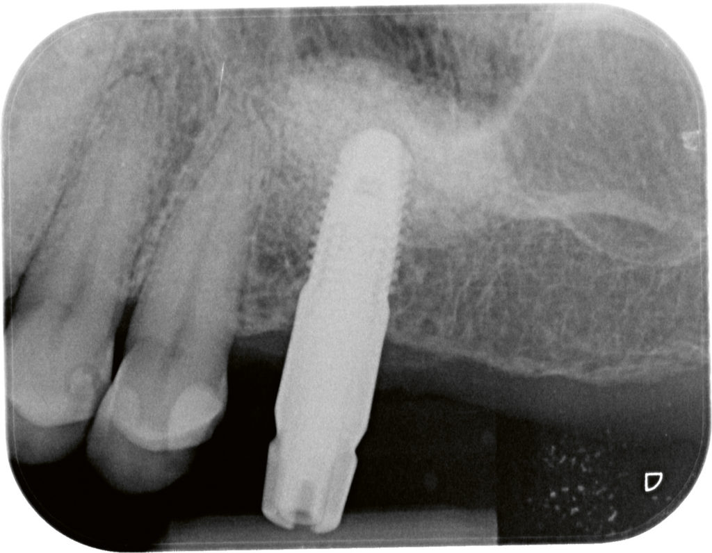 Die Oberkieferfrontzähne zeigten Taschentiefen bis 9 mm mit insgesamt einem deutlichen horizontalen sowie vertikalen Knocheneinbruch an Zahn 11. Weiterhin lagen ausgeprägte Rezessionen, vorangegangene Wurzelspitzenresektionen und apikale Aufhellungen vor (Abb. 5a und b). Deshalb wurde die Entfernung der Zähne 12 bis 21 beschlossen. Es sollten zwei Implantate (als Sofortimplantat) regio 12 und regio 22 inseriert und sofort festsitzend provisorisch versorgt werden. Zunächst wurde regio 26 ein Camlog Implantat mit einem externen Sinuslift inseriert. In einem zweiten OP-Termin wurden die Zähne 12 bis 21 entfernt, zwei Camlog-Implantate regio 12 und 22 inseriert und die Alveolen 12 bis 21 mit Osteo Biol mp3 (Tecnoss) aufgefüllt (Abb. 5c und d). Man beachte auf dem postoperativen DVT (Abb. 5d unten) die nach palatinal versetzte Positionierung des Implantates regio 12 (Größe 3,8 x 13 mm) und die vestibuläre Auffüllung der Extraktionsalveole. Zudem wurden die beiden Alveolen 11 bis 21 mit doppelt gelegten Bio-Gide Membranen (Geistlich Biomaterials) abgedeckt und vernäht. Dadurch sollte nur eine vorübergehende Stabilisierung des Augmentats erfolgen. Die beiden Implantate wurden mit PEEK-Abutments versehen, provisorisch beschliffen und ein vorbereitetes Schalenprovisorium hierüber unterfüttert. Die korrekte Positionierung wurde durch einen auf die Unterkieferzähne aufgesteckten und im Labor vorbereiteten kleinen Bissträger vereinfacht. Durch die zuvor aufgeklebten Table Tops konnten jegliche Kontakte auf den Frontzähnen zur Einheilung vermieden werden (Abb. 6a bis d). In der Abheilphase wurden die insuffizienten Wurzelfüllungen der Zähne 14 bis 16 revidiert (Abb. 7a und b).