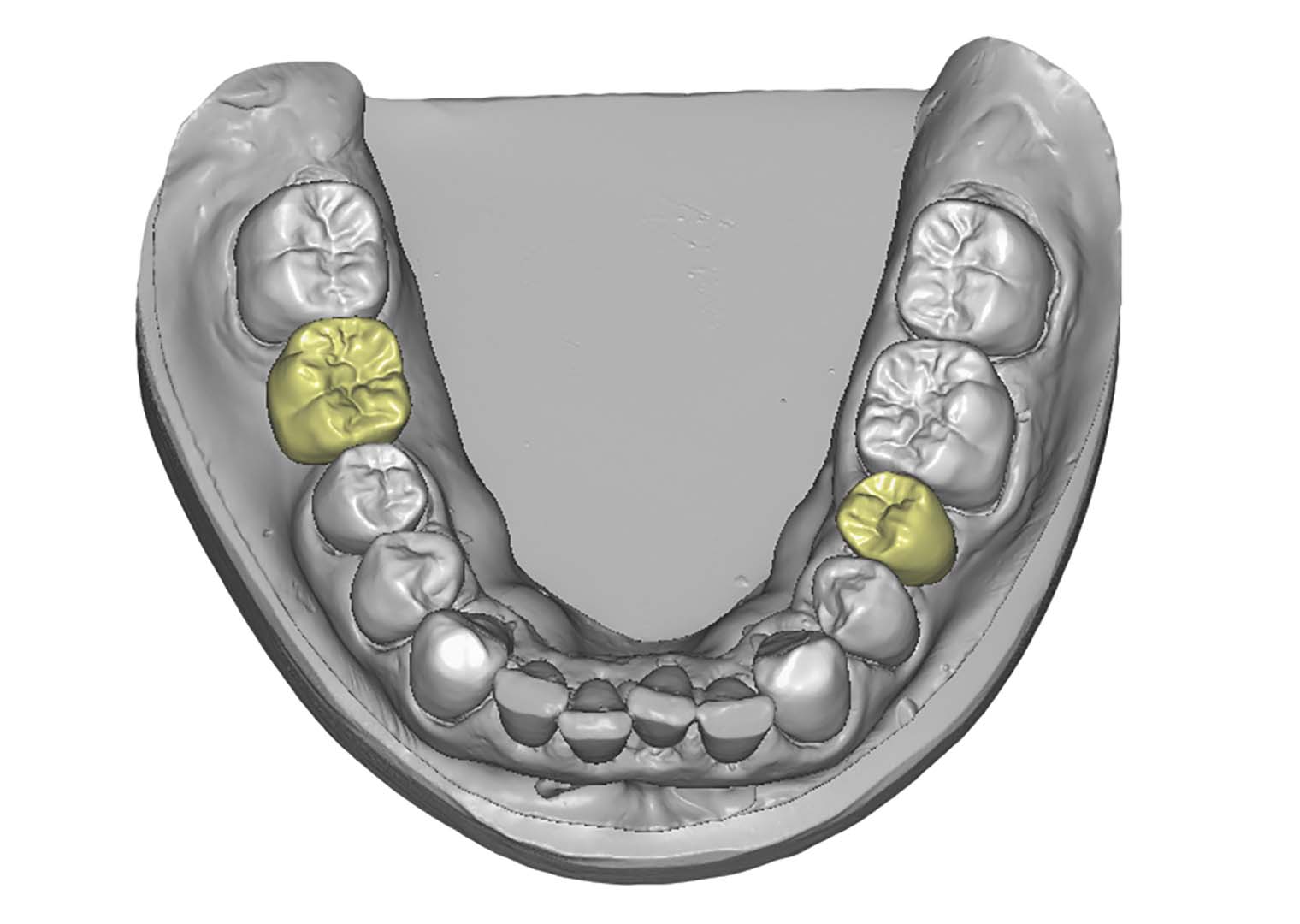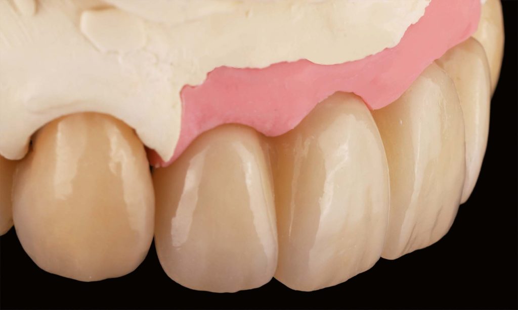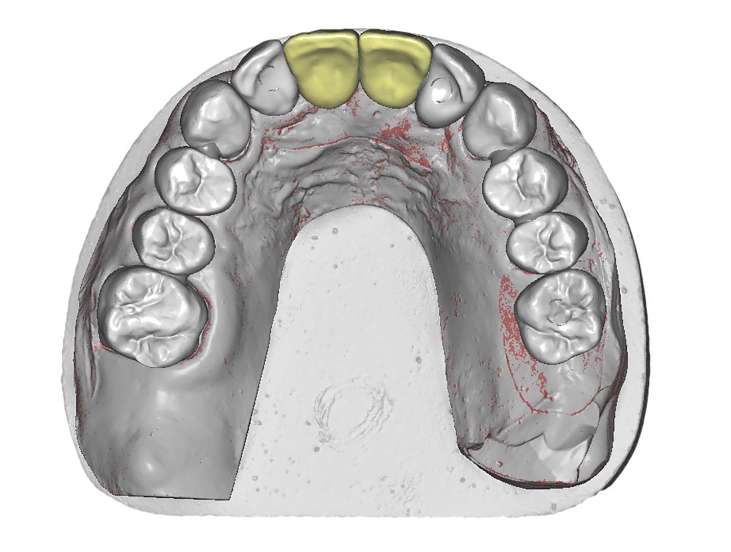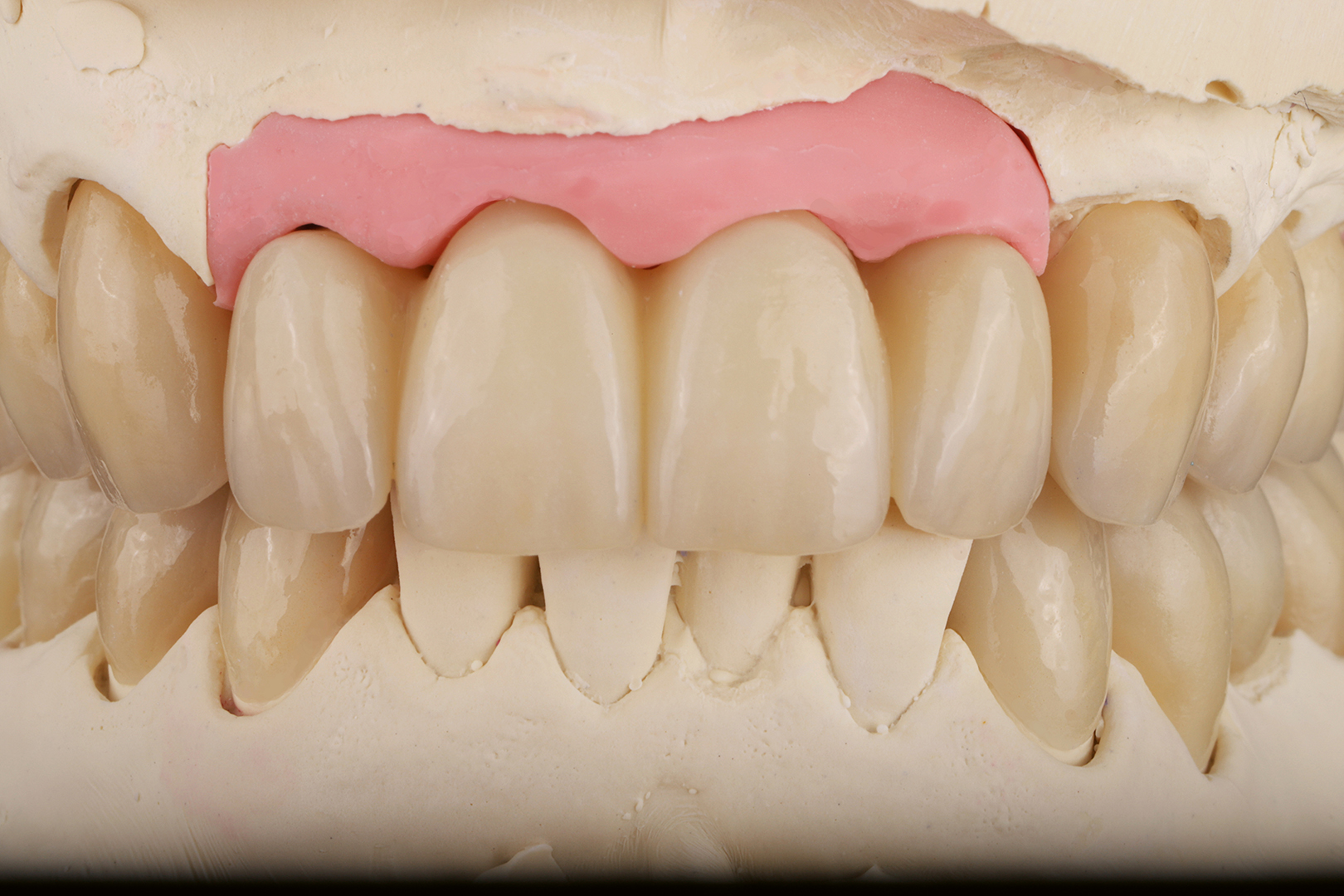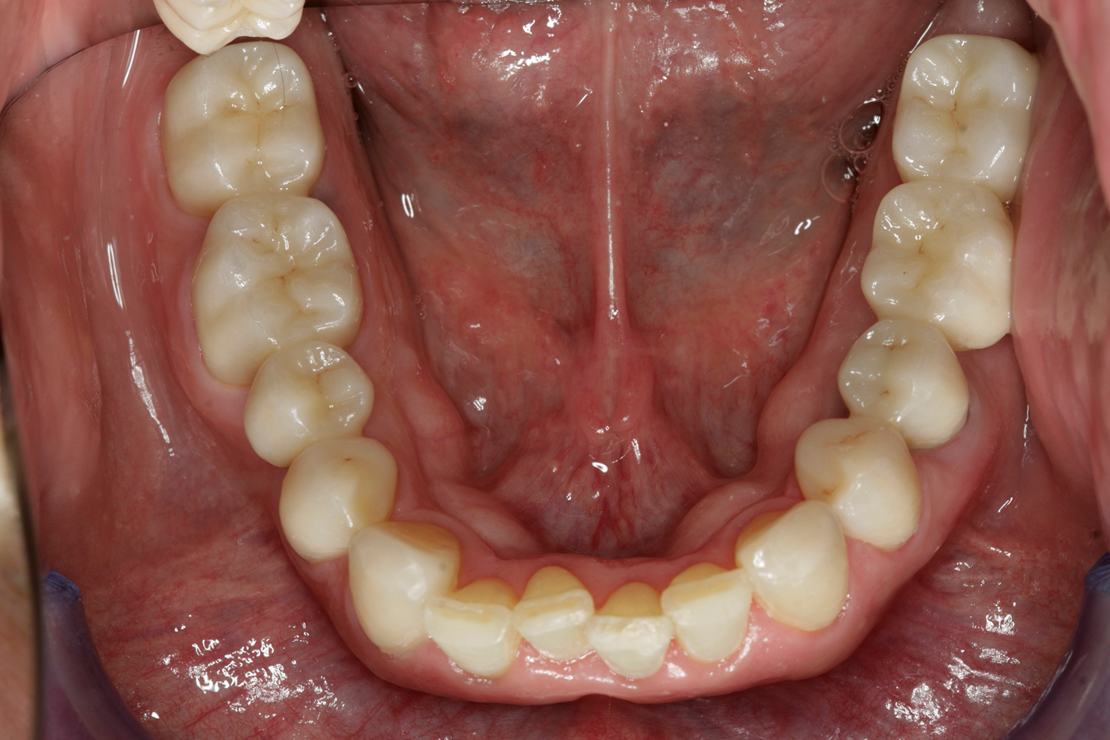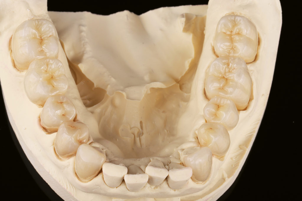 Zunächst wurde der funktionell störende Zahn 18 zusammen mit dem Brückenglied 17 entfernt. Parallel wurde die notwendige Parodontitistherapie eingeleitet. Zur Vorbehandlung der CMD wurden aufklebbare, zahnfarbene Schienen als Table Tops für den Unterkiefer angefertigt. Der Vorteil dieses Verfahrens besteht darin, dass der Patient die Schienen fortwährend über einen Zeitraum von mehreren Monaten trägt und diese bei Bedarf einfach korrigiert werden können. In dieser Zeit kann sich der Patient an die Bisshebung und zentrische Okklusionskorrektur gewöhnen und die Umsetzung erfolgt dann entsprechend in einer getesteten und für gut befundenen Situation in den endgültigen Zahnersatz. Durch die Konditionierung bei häufig verspannten CMD-Patienten gelingt die endgültige Registrierung so auch viel einfacher für ein passendes und korrekturfreies okklusales Relief der neuen Kronen.
