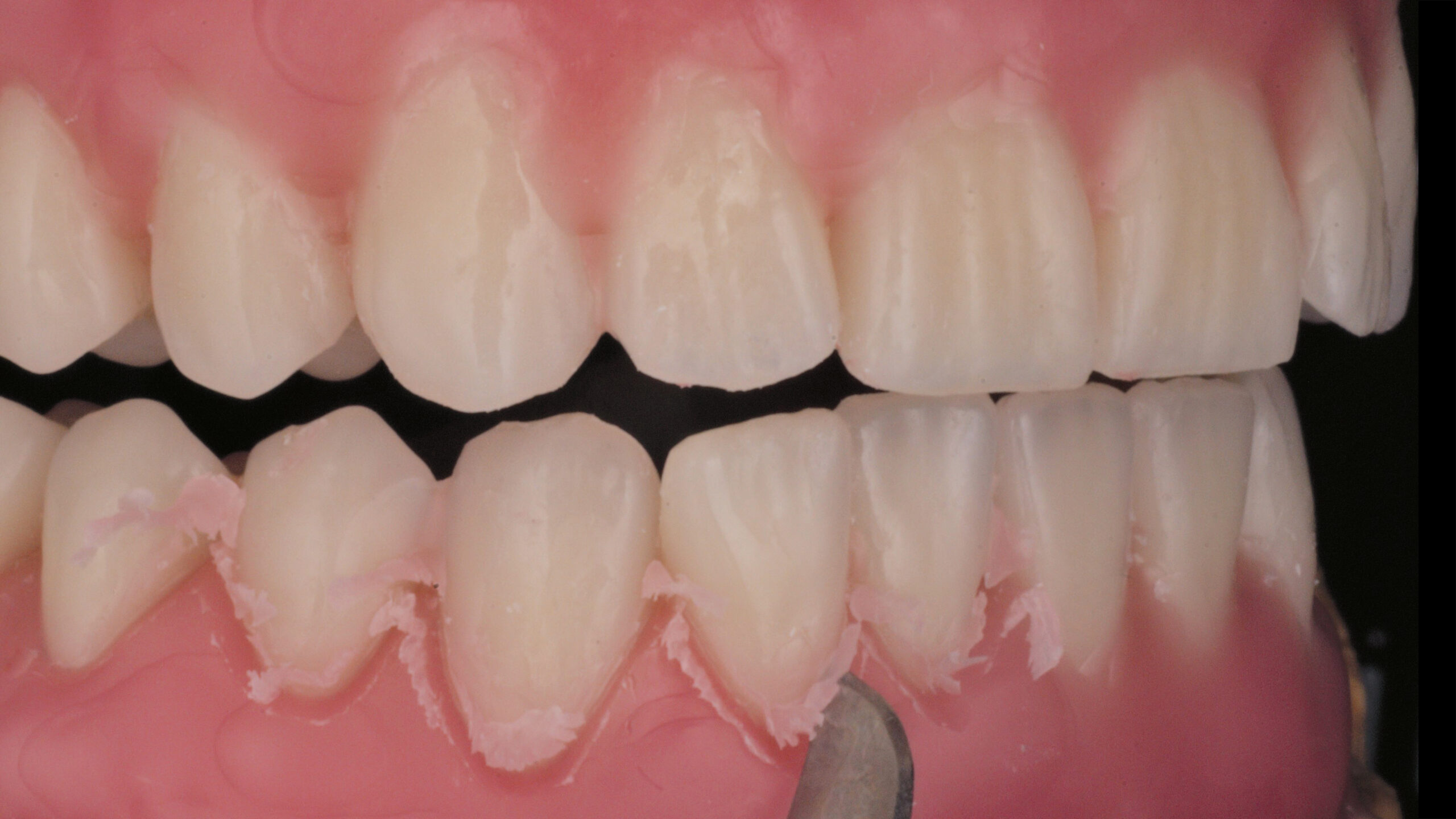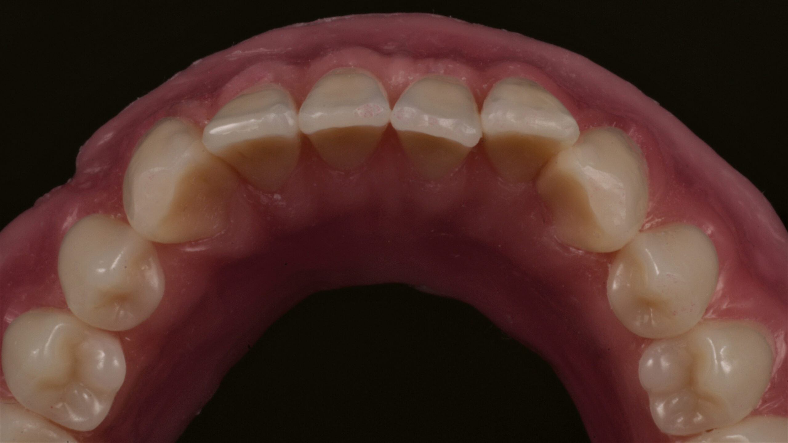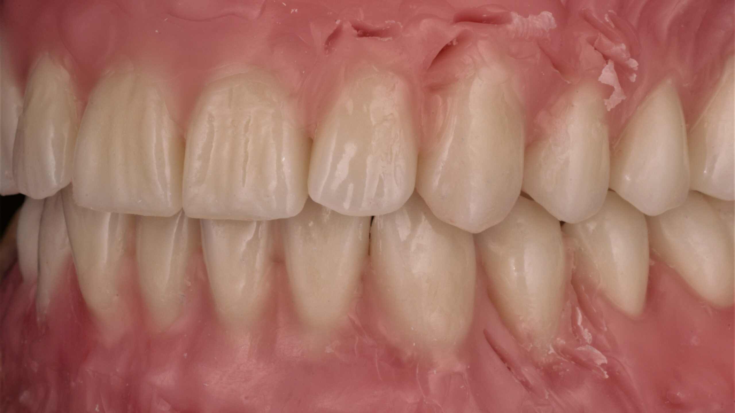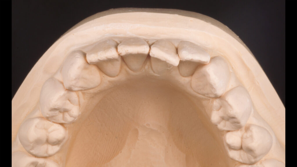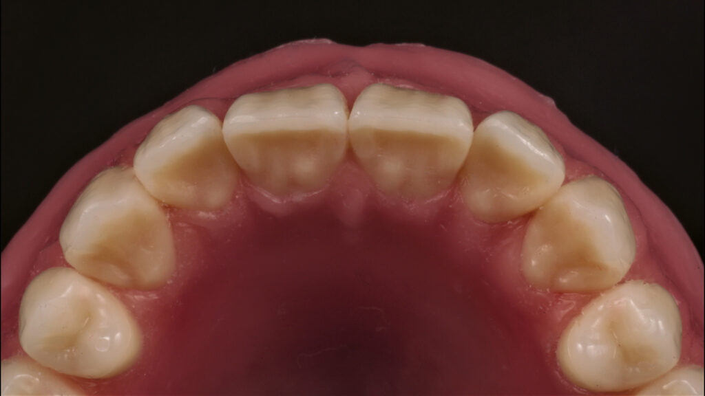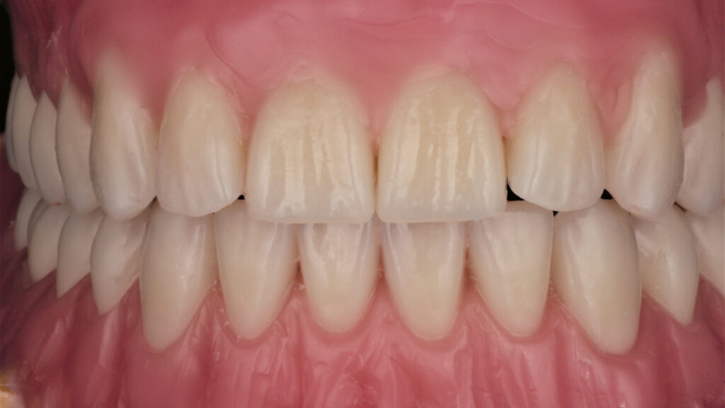 Die Pala Premium Frontzähne weisen bereits eine charakteristische Schichtung auf und verfügen über markante Formmerkmale wie Leisten und Furchen, dennoch geben sie genügend Raum, um die Oberfläche zusätzlich individuell zu charakterisieren (Abb. 8). Die Gegenüberstellung der bearbeiteten Oberflächen der Zähne 13 bis 11 und der unbearbeiteten Oberflächen der Zähne 23 bis 21 zeigt deutlich die Wirkung der Individualisierung (Abb. 9).