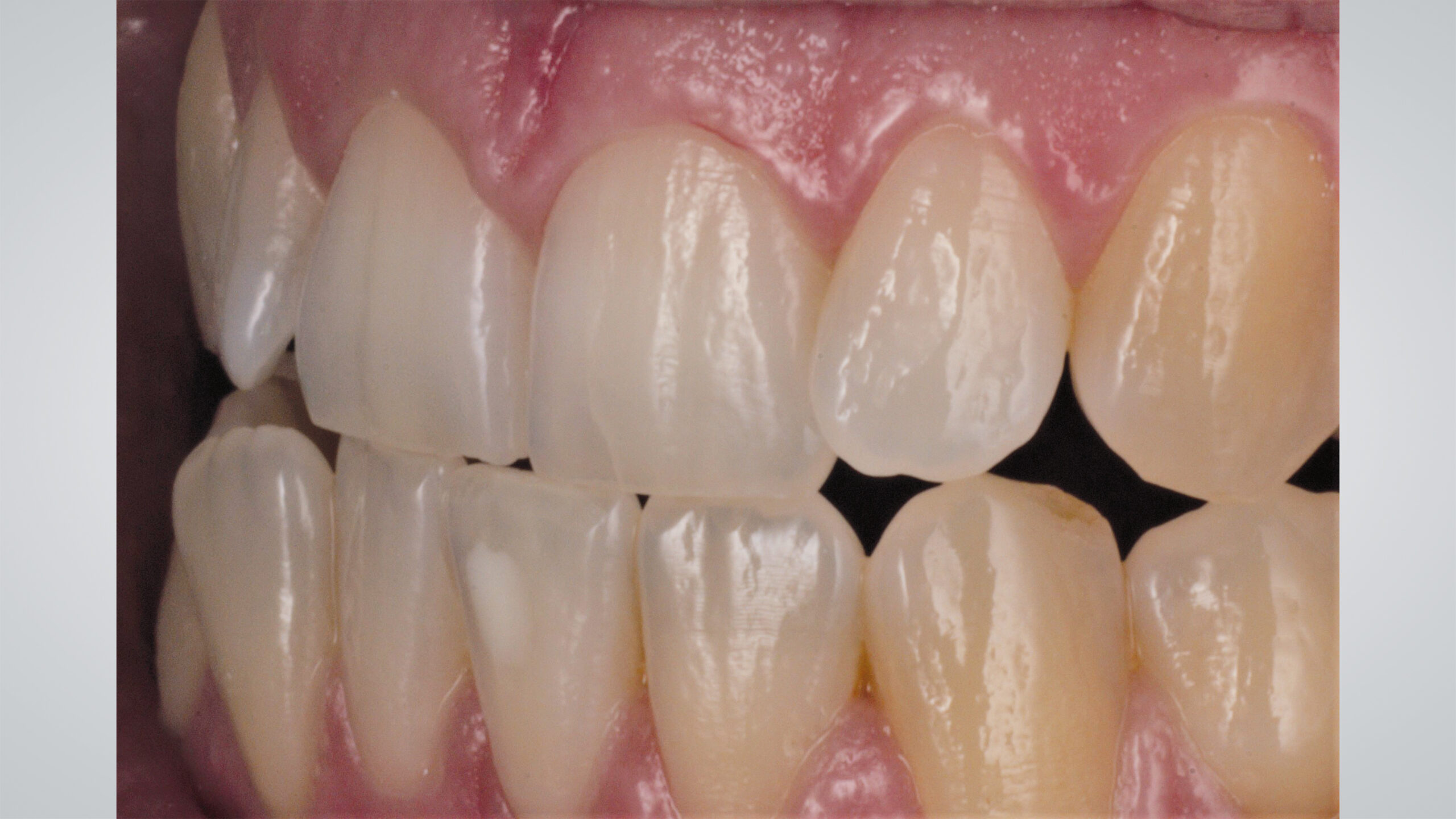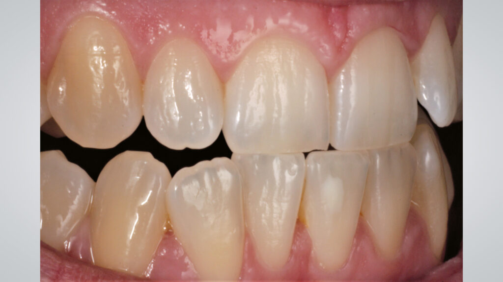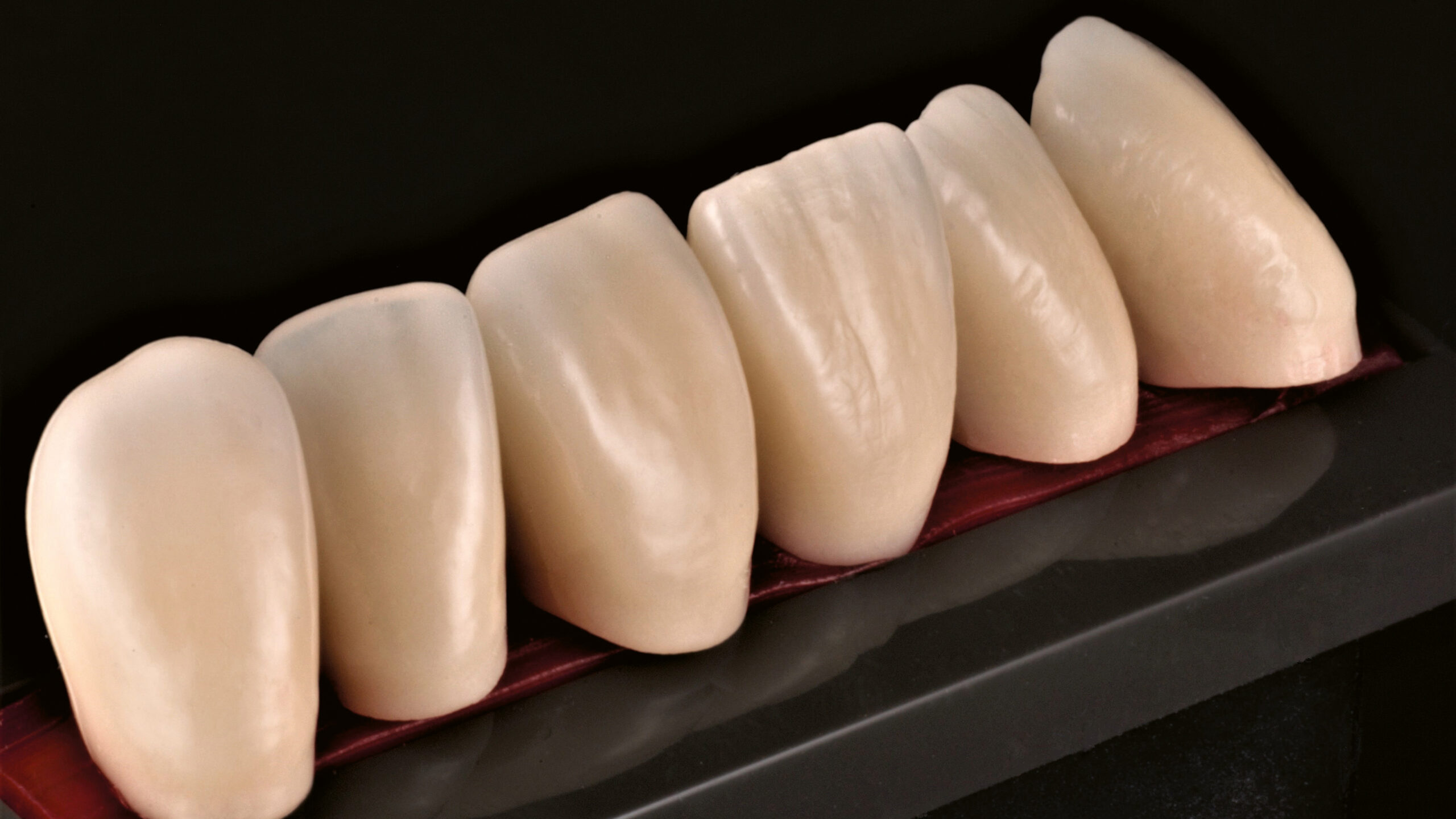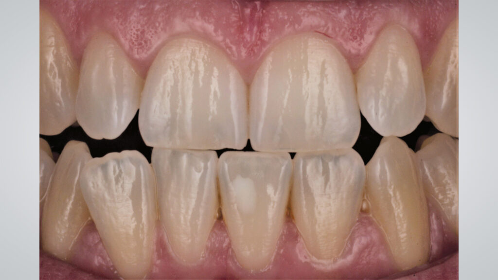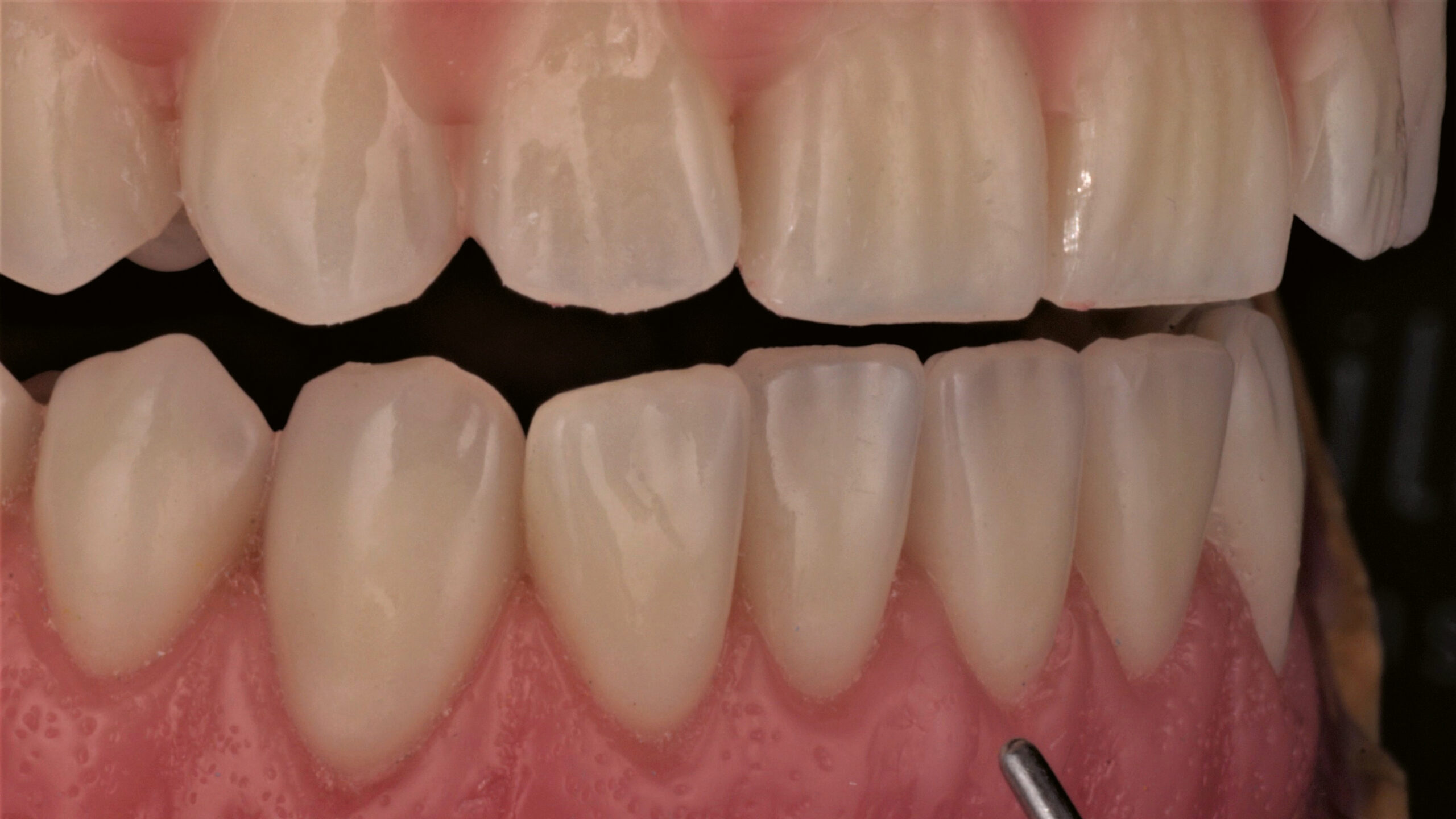 Die Pala Premium Frontzähne weisen bereits eine charakteristische Schichtung auf und verfügen über markante Formmerkmale wie Leisten und Furchen, dennoch geben sie genügend Raum, um die Oberfläche zusätzlich individuell zu charakterisieren (Abb. 8). Die Gegenüberstellung der bearbeiteten Oberflächen der Zähne 13 bis 11 und der unbearbeiteten Oberflächen der Zähne 23 bis 21 zeigt deutlich die Wirkung der Individualisierung (Abb. 9).