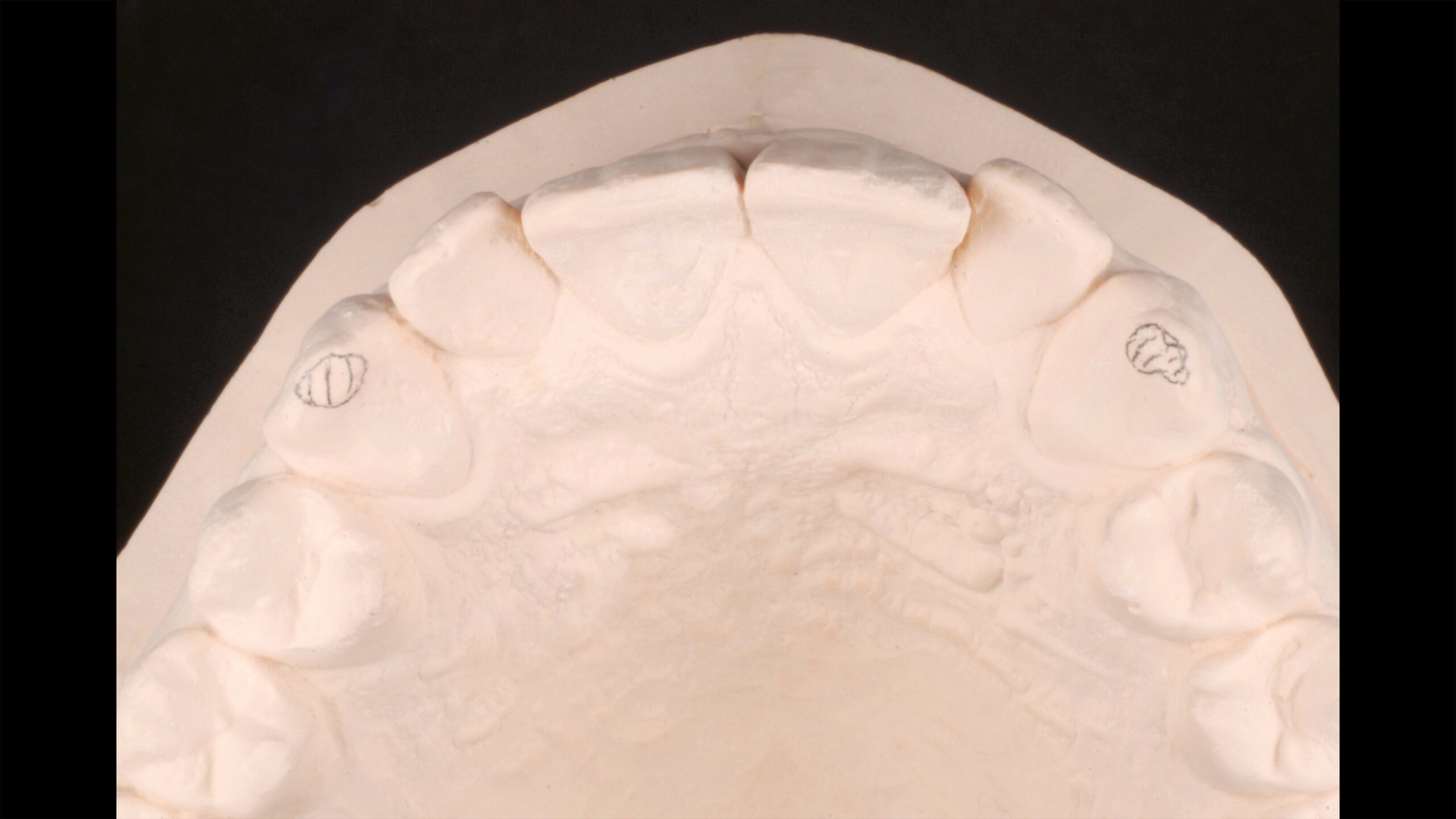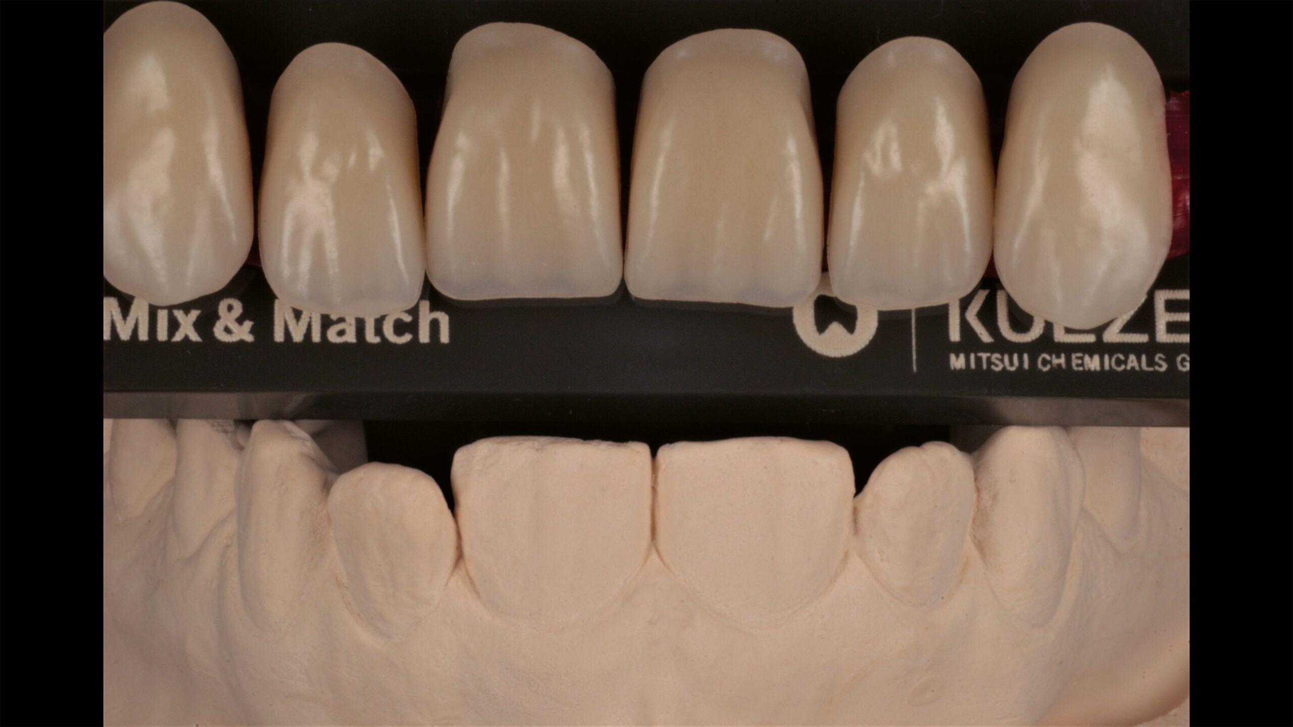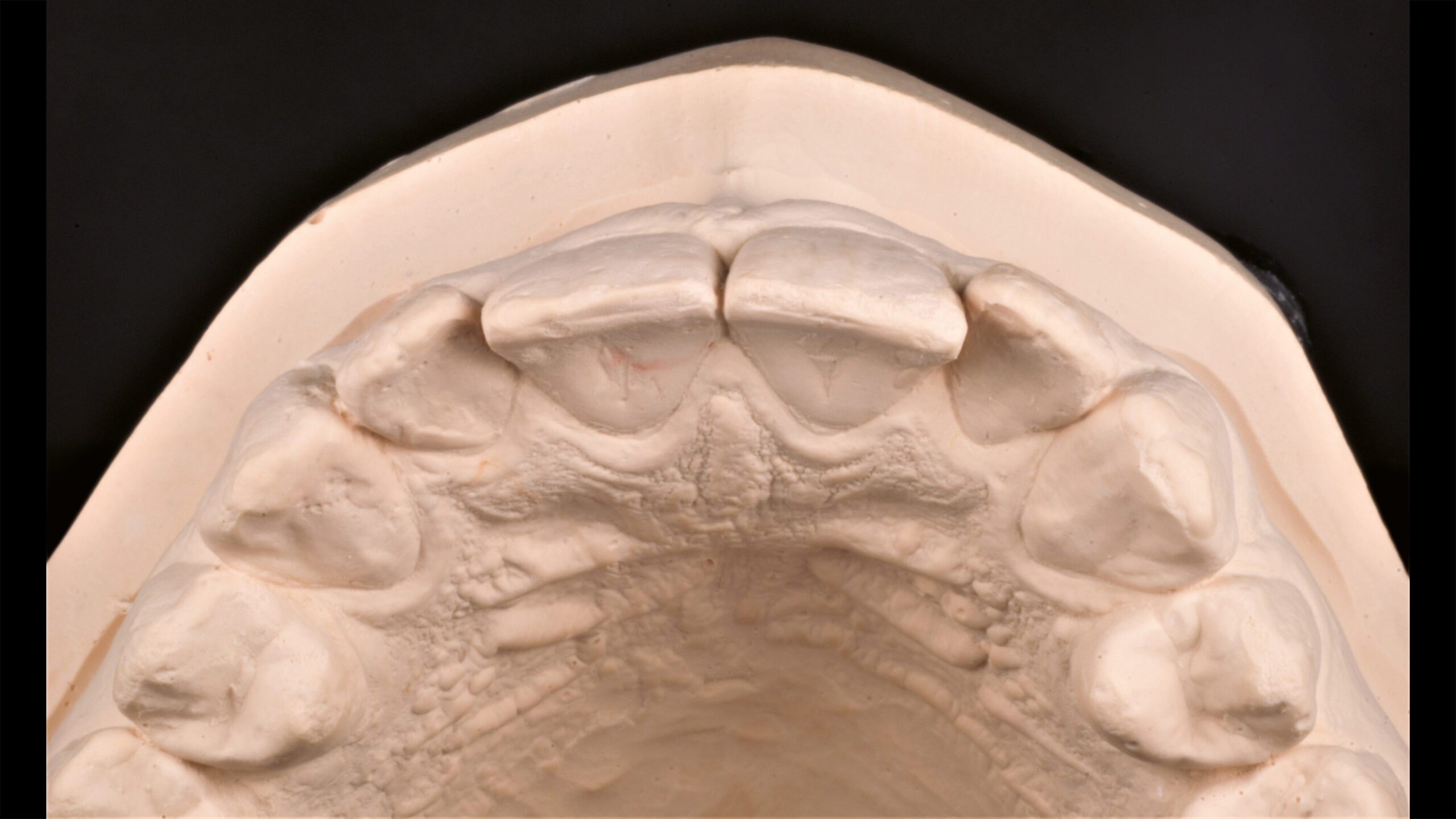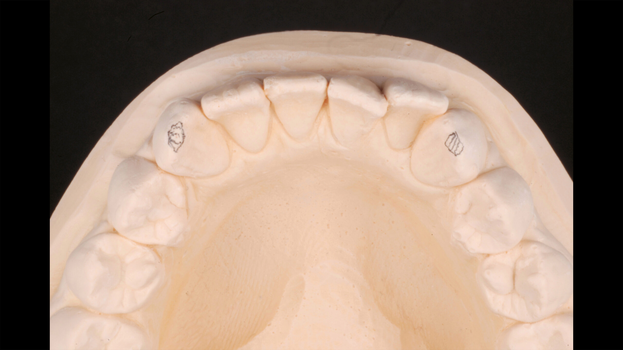 Die Pala Premium Frontzähne weisen bereits eine charakteristische Schichtung auf und verfügen über markante Formmerkmale wie Leisten und Furchen, dennoch geben sie genügend Raum, um die Oberfläche zusätzlich individuell zu charakterisieren (Abb. 8). Die Gegenüberstellung der bearbeiteten Oberflächen der Zähne 13 bis 11 und der unbearbeiteten Oberflächen der Zähne 23 bis 21 zeigt deutlich die Wirkung der Individualisierung (Abb. 9).