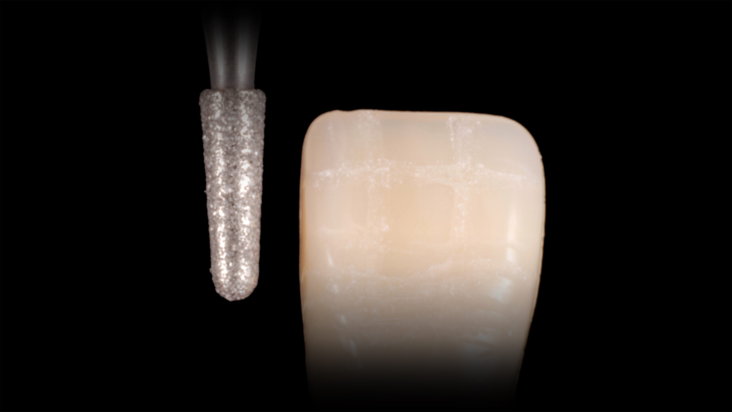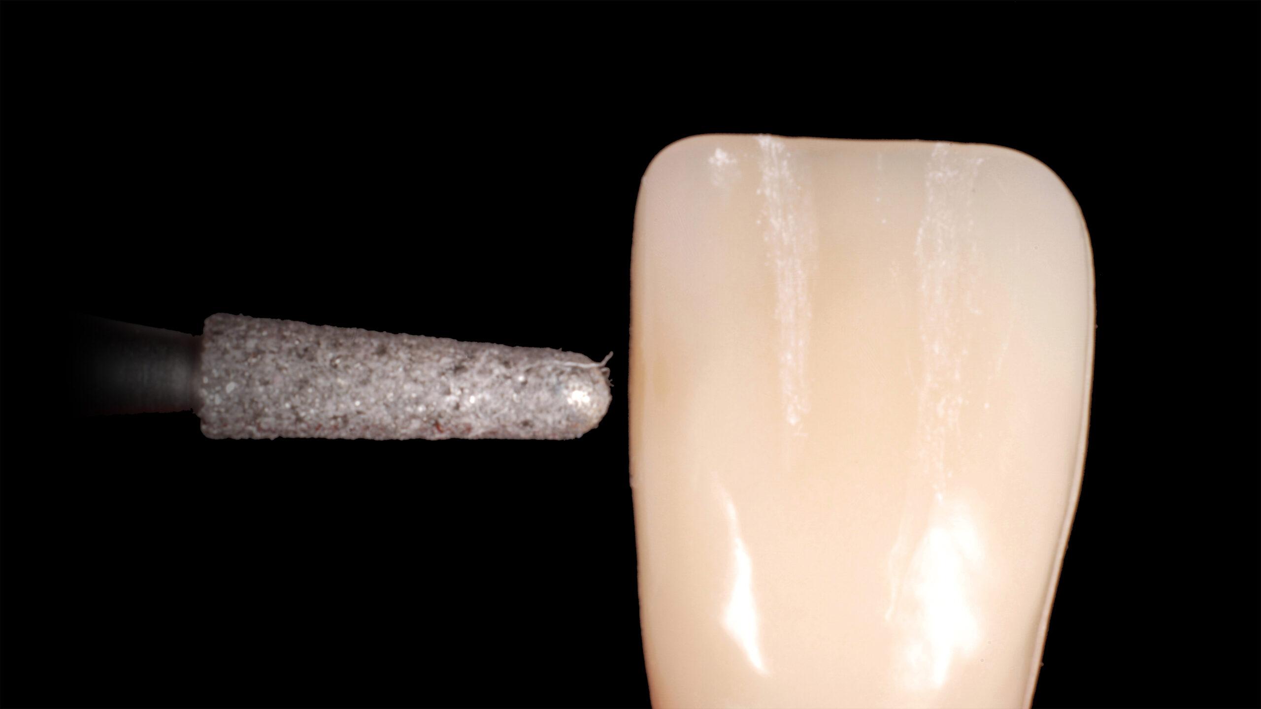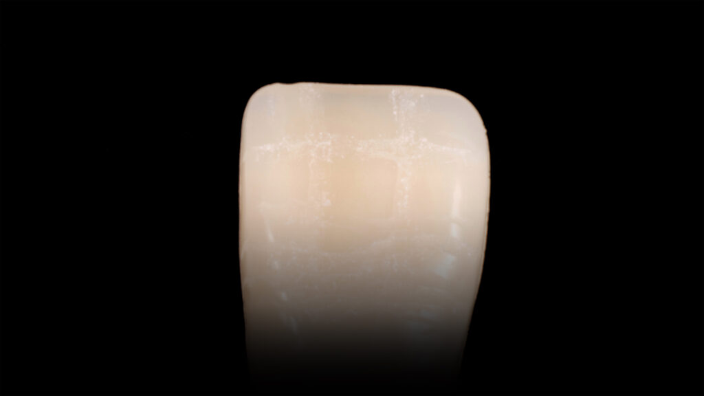 Die Abbildungen 10 bis 20 zeigen die Abfolge der Schritte bei der Bearbeitung der Oberflächenmorphologie. Mit verschiedenen Diamantschleifern werden Furchen, Wülste, Lichtleisten, Mamelons, Reflexionsflächen, Texturen und Perikymatien angelegt und die Oberfläche abschließend mit einem Ziegenhaarbürstchen bei niedriger Drehzahl manuell poliert.