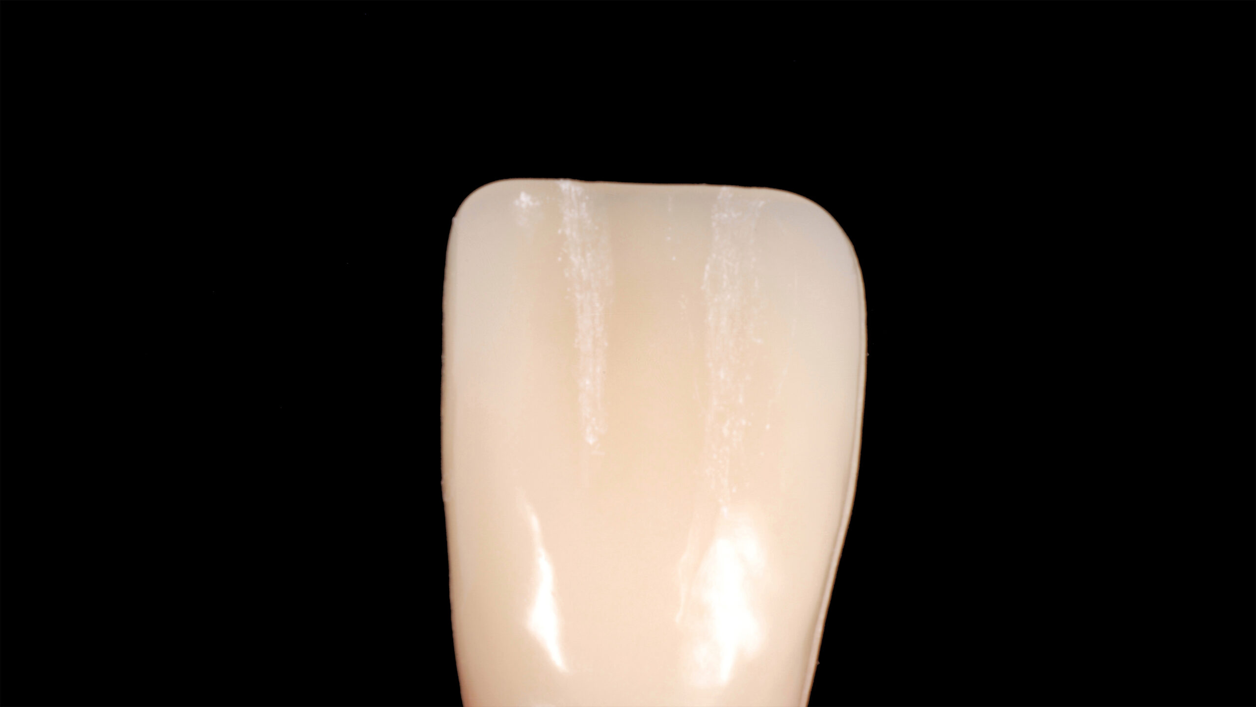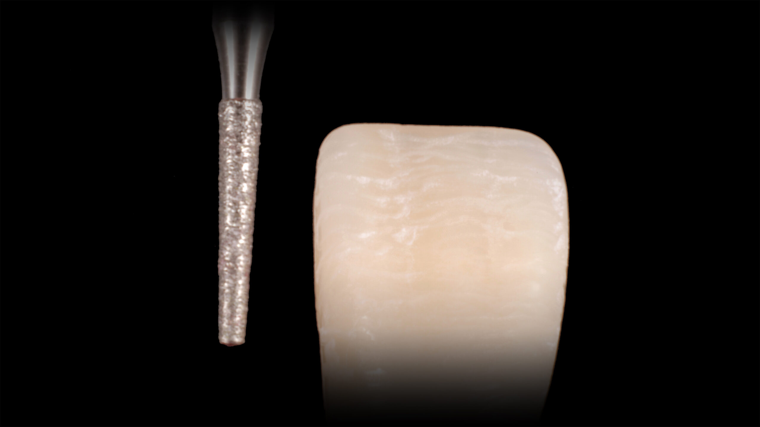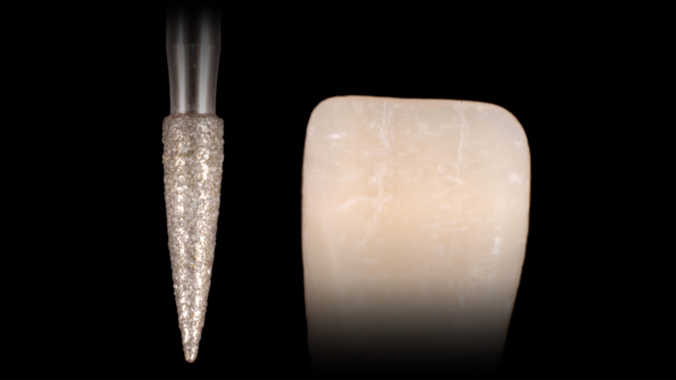 Die Abbildungen 10 bis 20 zeigen die Abfolge der Schritte bei der Bearbeitung der Oberflächenmorphologie. Mit verschiedenen Diamantschleifern werden Furchen, Wülste, Lichtleisten, Mamelons, Reflexionsflächen, Texturen und Perikymatien angelegt und die Oberfläche abschließend mit einem Ziegenhaarbürstchen bei niedriger Drehzahl manuell poliert.