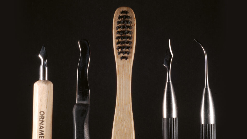 Als Erstes schneide ich mit einem spitzen Wachsmesser die Zahnhälse aus und entferne danach die Überschüsse von den Zahnoberflächen. Bereits bei diesem Schritt achte ich auf den natürlichen Verlauf des Zahnfleischsaumes (Abb. 34 und 35). Mit einer Künstlerfeder steche ich im zweiten Schritt die Interdentalräume sauber aus und verfeinere die marginalen Übergänge (Abb. 36), anschließend modelliere ich die Wurzelfortsätze mit der löffelförmigen Rückseite des Wachsmessers (Abb. 37). Für das natürliche Erscheinungsbild benutze ich eine Zahnbürste mit harten Kunststoffborsten (Abb. 38), abschließend modelliere ich das Lippenbändchen mit einer Sonde (Abb. 39). Alle verwendeten Modellationswerkzeuge sind in Abbildung 40 zu sehen.